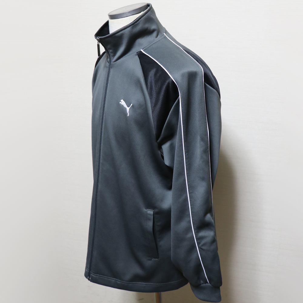 日本正規 USED美品 PUMA プーマ ZIPアップ トラックジャケット ワイドパンツ セットアップ チャコールグレー×白パイピング 黒切替 胸ロゴ刺繍 Lサイズです。