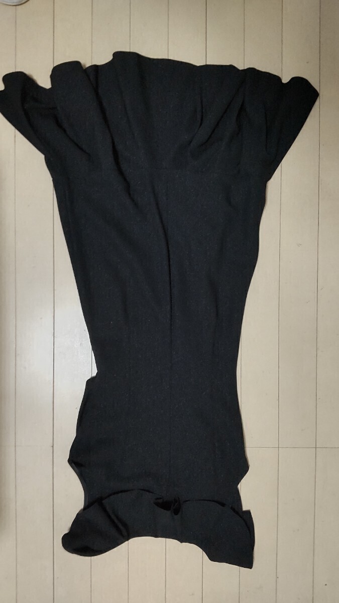 結婚式の時に一回だけ着用しました。生地はブラックに小さいラメが織り込んであって、キラキラと華やかな印象です。アシンメトリーで、膝上〜膝下丈になります。程よく伸縮性があり、体のラインを綺麗に見せてくれます。着る機会が無くなったため、自宅整理のために出品します。シワになりにくい素材なので、あまり気にされない方はレターパック発送可能です。