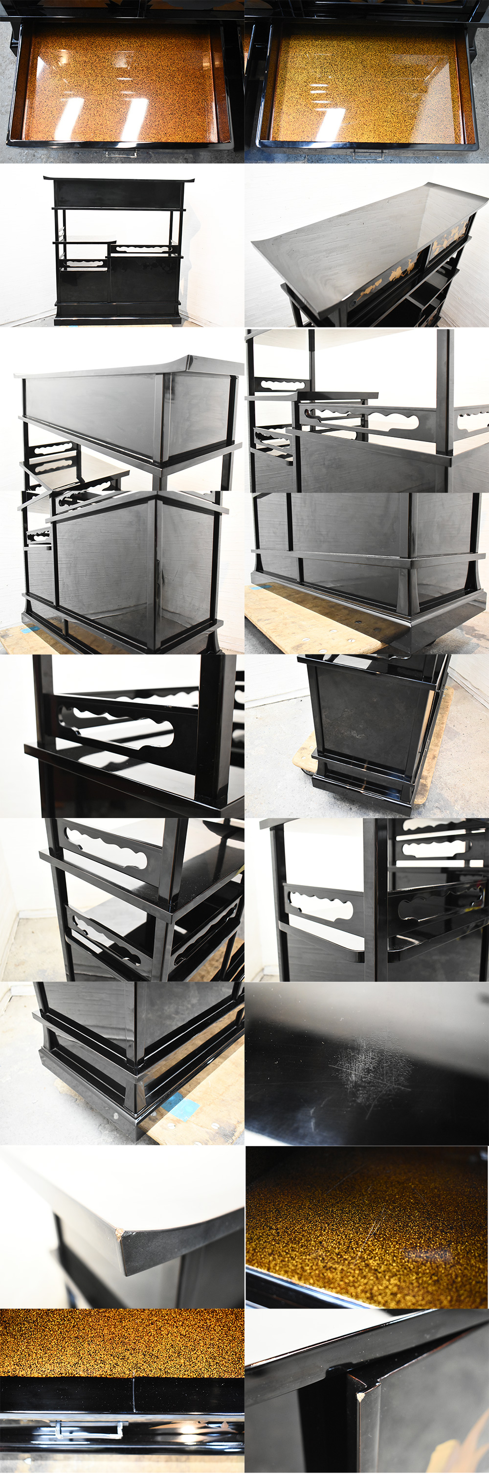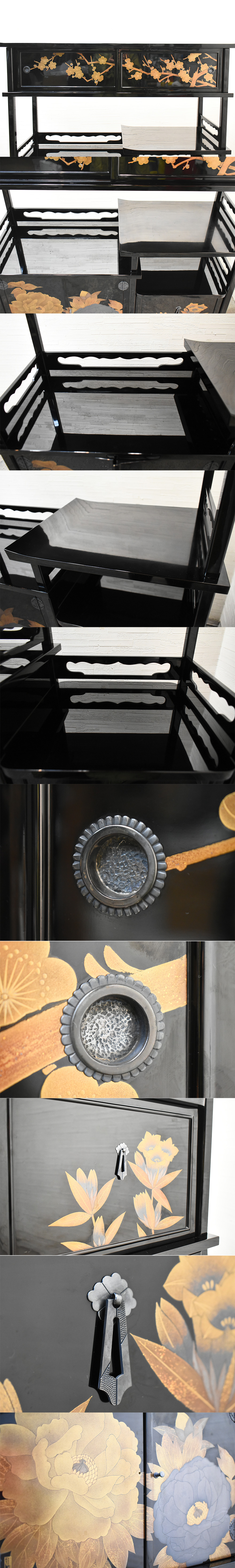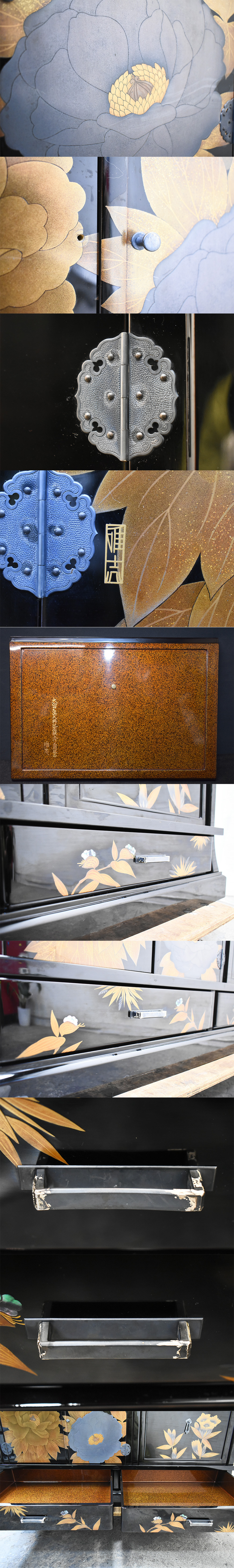 最高峰/井波唯志作/巨匠/輪島塗/漆芸/茶棚/茶箪笥/取手純銀/梨地塗/飾り棚/時代家具/蒔絵/金彩/沈金/草花図/高級/伝統工芸品の出品になります。 丈夫で上品な伝統工芸、輪島塗の飾り棚になります。取っ手部分には純銀が使用され、細部にまで職人のこだわりが感じられるお品になっております。和の空間作りにいかがでしょうか。 その他画像にあるものはイメージとして用いたもので付属品ではございません。 コンディション 経年と使用による傷・汚れ等がございます。 引き出し取っ手裏に純銀刻印あり。 扉の取っ手が一つ紛失しております。 扉の開閉が硬かったり、緩かったりしております。 画像にて商品の状態をよくご確認の上ご判断いただき、神経質な方のご購入はお避け下さい。 撮影状況や光の加減で画像の色合いが現物と若干異なる場合がございます。 画像に写っているものが全てです。 現状でのお渡しとなります。 上記の点をご理解ご了承いただいた上で、ご入札お願いいたします。 サイズ W×D×H: 約1110×400×1150 (mm) メーカー(国名) /// デザイナー 井波唯志 製造年代 /// 材質 /// 色 画像参照 参考上代 /// 自社商品評価 C 評価判断基準 ・S 新品。若しくは未使用品。 ・A+ 新品同様品。傷や使用感がほとんどなく、非常に綺麗な状態。 ・A 美品。小さな傷などはあるが気になるレベルではなく、綺麗な状態 ・B 良品。傷や汚れなど若干の使用感はあるが、大きな痛みがない状態 ・C 中古品。使用上の問題はないが、気になる傷や汚れなど痛みがある状態 ・D ジャンク品。使用の上で問題がある状態。コンディション欄コメントを参照 ※上記評価は弊社規定にて判断させて頂いたものになります。商品画像、説明文に出来る限り状態を記載させて頂きますのでよくご閲覧頂いた上、自社商品評価はあくまでも参考としてご判断頂けますようお願い申し上げます。 |