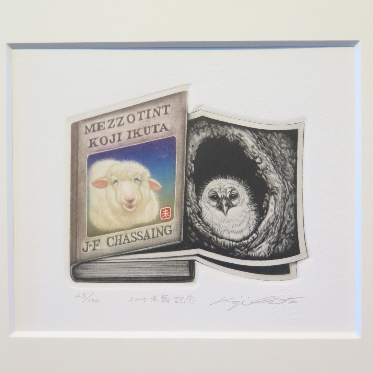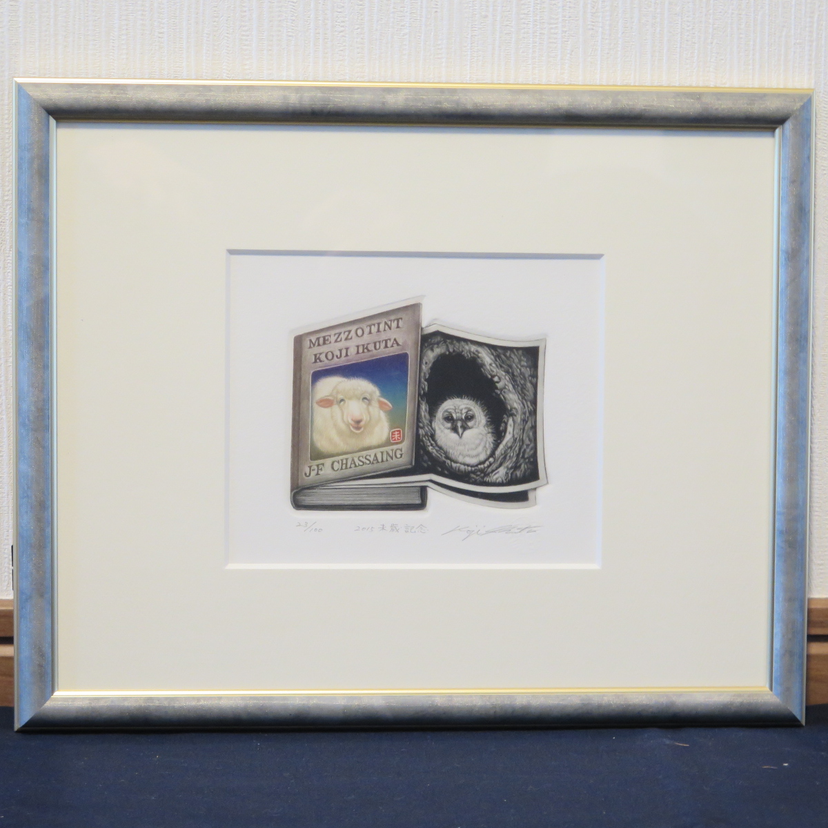 作品は【 2015羊歳記念 】干支のかわいい羊、来年の干支飾りにご準備いかがでしょうか。個展に於いて作家本人からの購入です。カラーメゾチント。画面10.4*8.4㎝、ミニアチュール的な細密画です。画面にサイン、エンボス、タイトル、限定エディション23/100、年記2015。シートサイズ17.3*17.1㎝(フルマージン)。状態は良好です。額装サイズ32.3*26.2*1.5㎝。