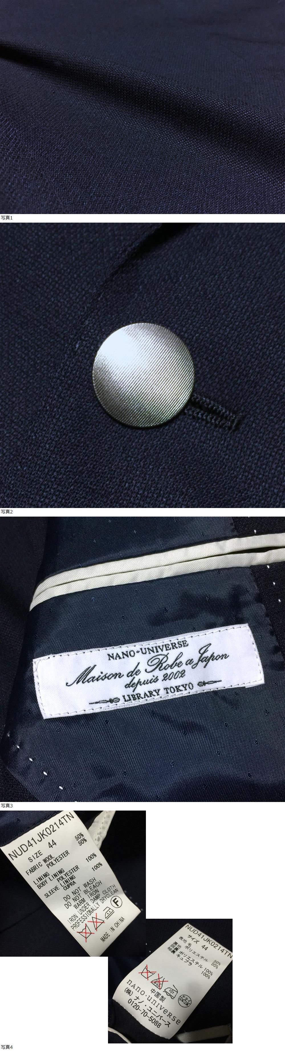 | 【ブランド】 NANO UNIVERSE ナノ・ユニバース 【デザイン・モデル】 NUD41JK0214TN メタル釦 ウール混 2B 紺ブレザー テーラードジャケット 【生産】 ㈱ナノ・ユニバース 【詳細・コメント】 NANO UNIVERSE ナノ・ユニバース メタル釦 紺ブレザーになります。さらりと上質ポリエステル/ウール地で仕立て、こだわりのメタルボタンや細身のシルエットの、トラディショナルな雰囲気漂うデザインです。仕立てはシングル2ボタン、袖口4ボタン、背抜き、センターベンツです。これからの季節に最適です。 正規品です。 【サイズ】 表記: 44 (メンズS程度) ※実寸を参考にして下さい。 平置実寸:身幅47㎝ 着丈69cm 肩幅41㎝ 袖丈61㎝ ※多少の誤差はご了承ください。 【カラー・パターン】 濃紺 ダークネイビー ※ご覧になられるモニターや、デジカメの撮影具合によって色味が異なる場合がございますのであらかじめご了承ください。 【品質】 表地:毛50% ポリエステル50% 裏地:(胴裏)ポリエステル100% (袖裏)キュプラ100% 【コンディション】 USED 中古品 です。目立ったダメージも無くきれいです。まだまだ着ていただけます!※写真参考に判断して下さい。ユーズドアイテムにご理解ある方のみご入札お願い致します 。 | |||