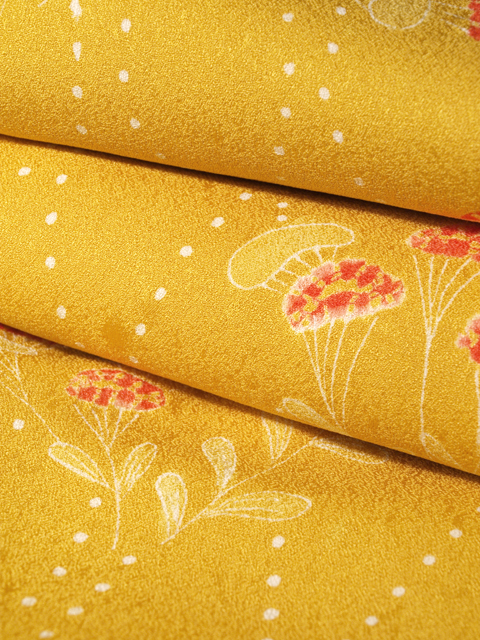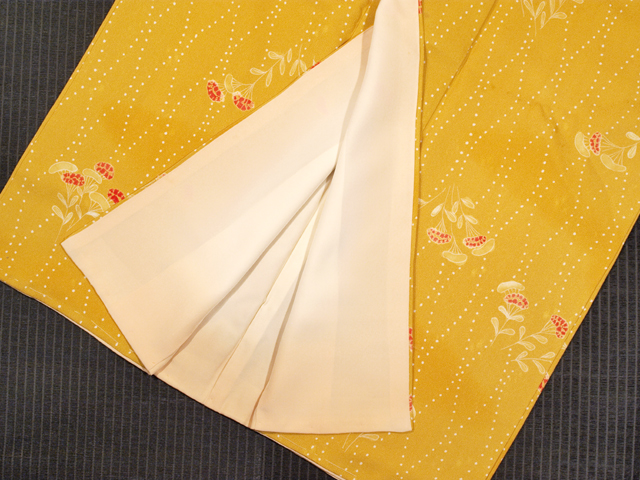 | 詳細 | 沈んだ山吹色の地にあられの地紋が織り出され、点でかたどられた立涌と女郎花の文様、ところどころに杏(あんず)色のぼかしの文様が染められている紋綸子の小紋です。袷仕立てです。 女郎花の文様の一部に薔薇(ばら)色で施された絞り染めが良いアクセントになっています。小粋でかわいらしい装いができそうですね。 しつけ付きの仕立て上がり未使用保管品です。胴裏などに若干の経年感はありますが、しみやよごれ、褪色などのダメージも見あたらず、ほぼ新品同様にきれいです。 |
