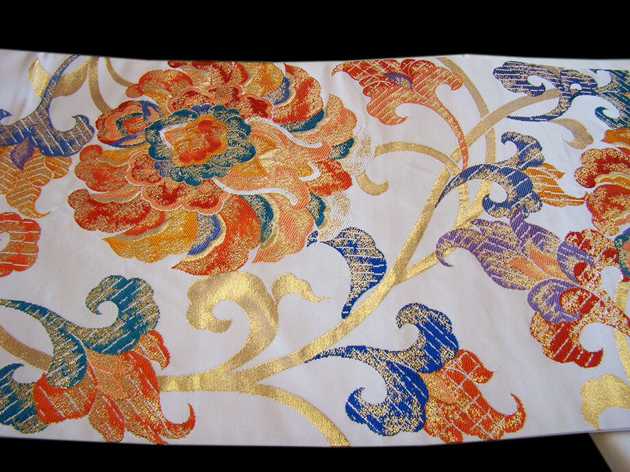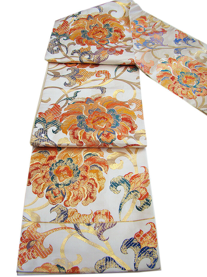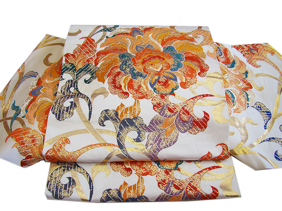 | 商品説明 | 大変しなやかな手触り良い重厚感が際立つ西陣織の袋帯。 お顔映りも華やかなミルキーホワイト色地に金糸、藍、菫、青緑、 山吹、柿、フラミンゴ色等の大輪の花柄の織柄。 六通柄。 ※滑らかな裏地といい手触りや織等からブランドの帯と思われますが 仕立て上りのため残念ながら機番はわかりません。 |