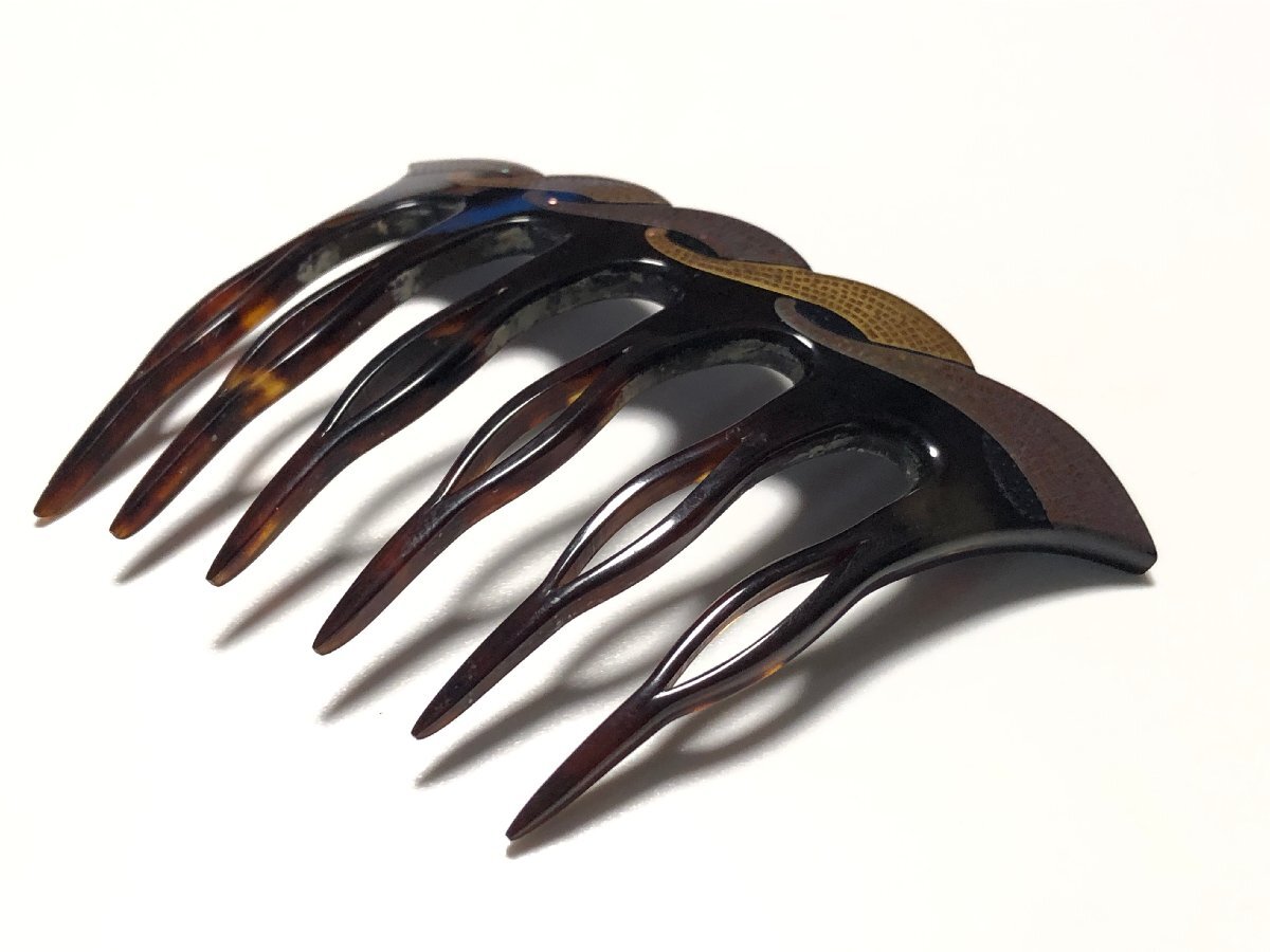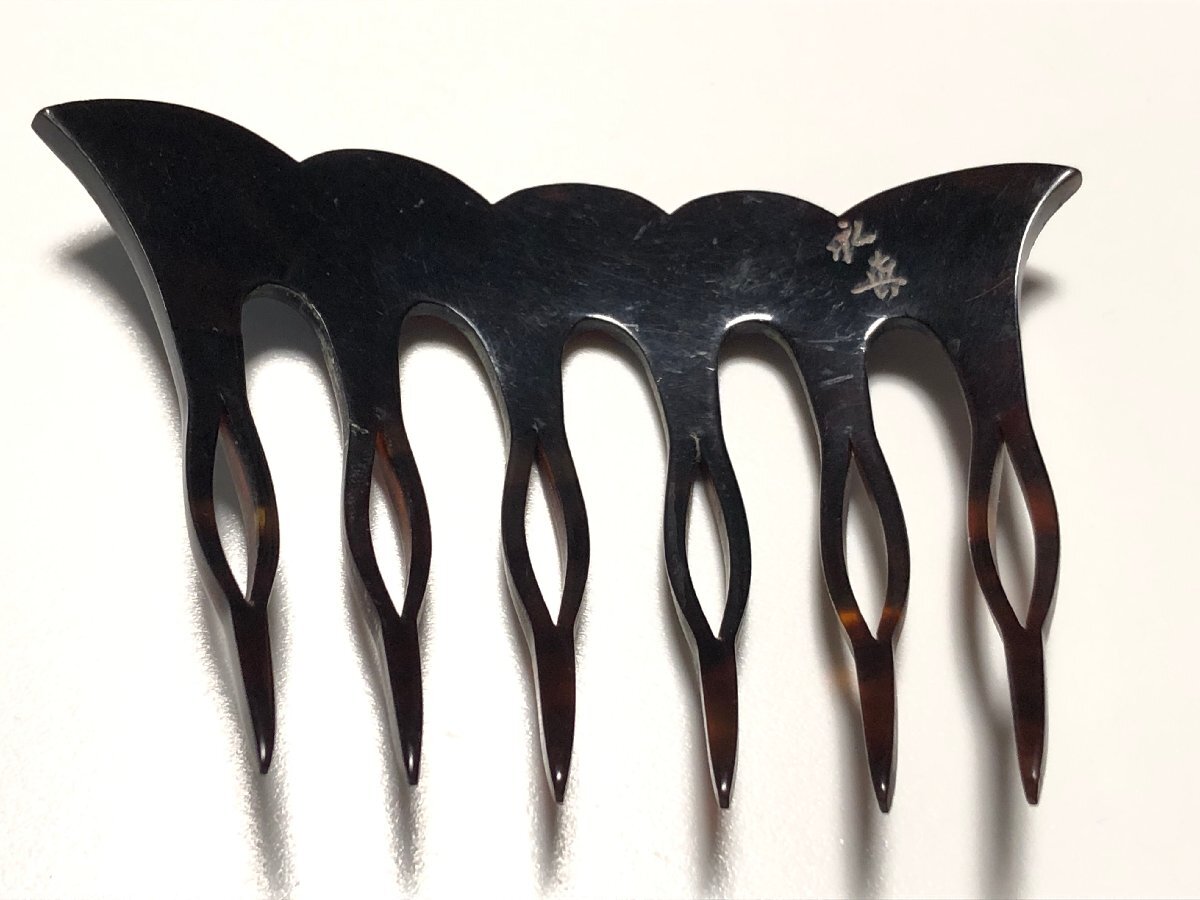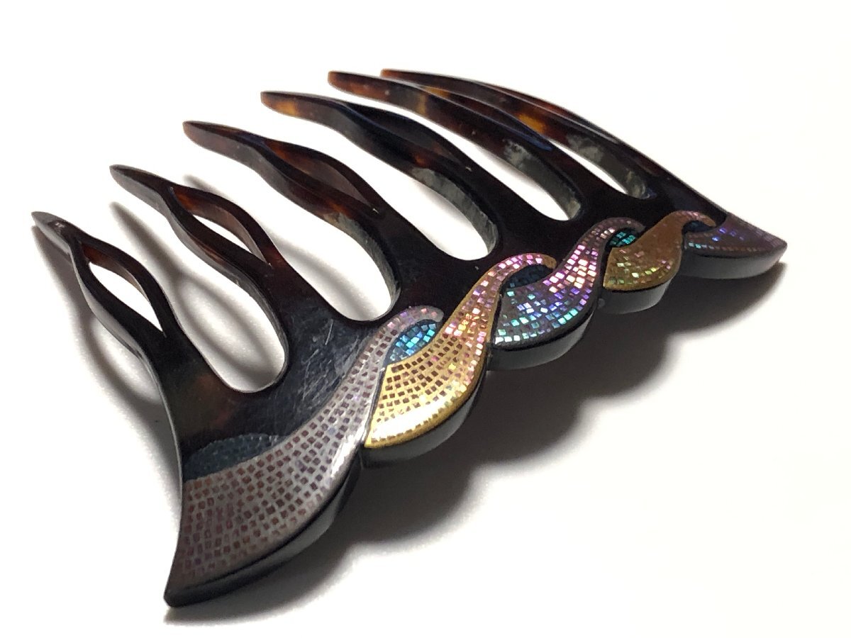 アンティークの本鼈甲を使用し、漆塗り、金蒔絵、螺鈿を施した、波形の櫛です。作者、永英の銘があります。鼈甲部分に欠けや虫食いはありません。小キズ、若干の汚れがあります。| 出价者 | 信用 | 价格 | 时间 |