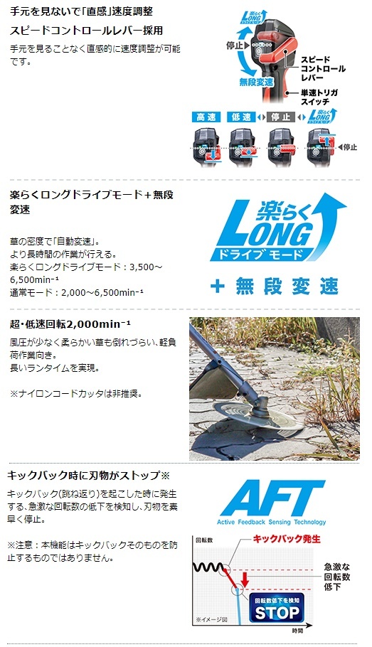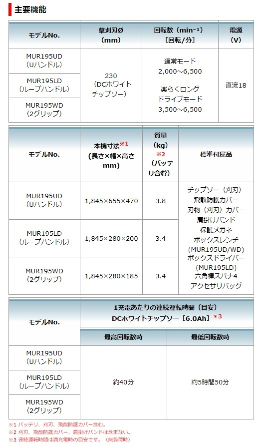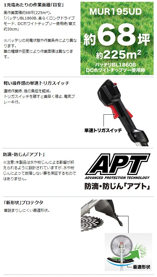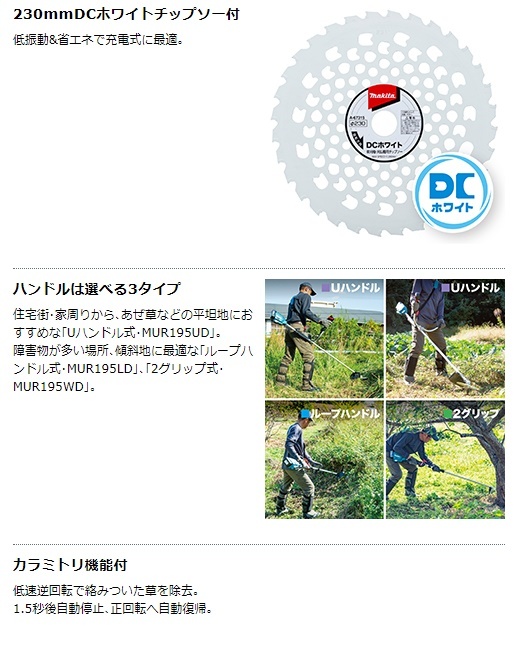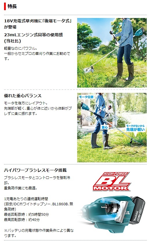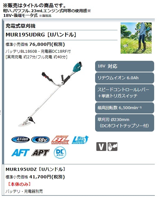 マキタ makita充電式草刈機MUR195UDRG[Uハンドル]バッテリBL1860B・充電器DC18RF付■18V充電式草刈機に「後端モータ式」が登場・23mLエンジン式同等の使用感(マキタ社比)・優れた重心バランス■ハイパワーブラシレスモータ搭載■手元を見ないで「直感」速度調整・スピードコントロールレバー採用・楽らくロングドライブモード+無段変速・超・低速回転2,000min-1■キックバック時に刃物がストップ※※注意:本機能はキックバックそのものを防止するものではありません。■軽い操作感の単速トリガスイッチ■防滴・防じん「アプト」※注意:本製品は水や粉じんによる影響が抑えられるように設計されていますが、水や粉じんによって故障しない事を保証するものではありません。■「新形状」プロテクタ■230mmDCホワイトチップソー付■カラミトリ機能付低速逆回転で絡みついた草を除去。1.5秒後自動停止、正回転へ自動復帰。197050002952
