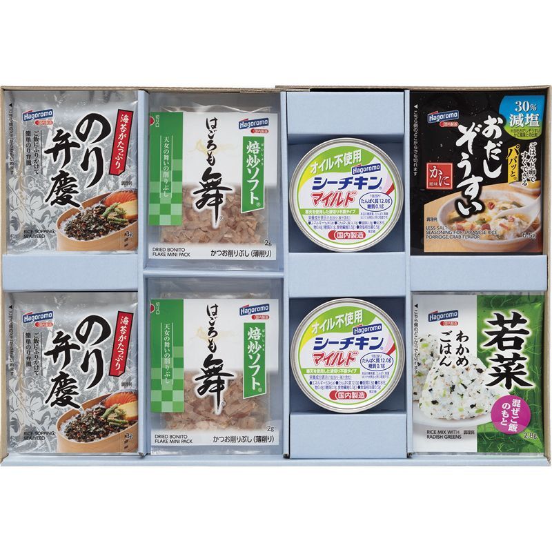【セット内容】のり弁慶ふりかけ(3g)・焙炒ソフトパック(2g)×各4、オイル不使用シーチキンマイルド(70g)・減塩おだしぞうすいかに(6.5g)・わかめ混ぜご飯若菜(2.8g)×各2