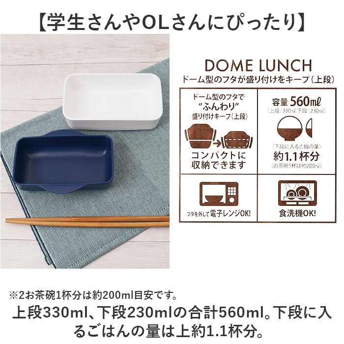 | 商品説明 | ・・【毎日のランチタイムのお供に】 ・美味しく食べられて、すっきりフォルムで持ち運びもしやすい「ドームランチボックス 2段」。 ・【2点ロックで汁漏れの心配を軽減】 ・両サイドのロック&フタ裏にはパッキン付き。汁漏れしにくく持ち運び時も安心。 ・(※1)密閉仕様ではありません。 ・【押し潰れを防いで見た目もキレイ】 ・ふわっと盛り付け可能な、ドーム型の上段フタ。見栄えも美味しさも、ぐんとアップ☆ ・【学生さんやOLさんにぴったり】 ・上段330ml、下段230mlの合計560ml。下段に入るごはんの量は上約1.1杯分。 ・(※2)お茶碗1杯分は約200ml目安です。 ・【ごはんがくっつきにくい加工】 ・下段内側にエンボス加工(特殊樹脂加工)をプラス。ご飯粒を残すことなくキレイに完食◎ ・【入れ子式でコンパクトに収納】 ・食べ終わったら、下段が上段に収まる入れ子式。かさばらず、持ち帰りがラクラク。 ・【レンジ対応!熱々ごはんが復活】 ・フタを外して電子レンジでの温めが可能。オフィスでも温かいランチを楽しめる! ・【食洗機OK!洗い物の手間を軽減】 ・パーツが少なく、パッキンは取り外せて衛生的◎すべて食洗機対応で、忙しい毎日の味方☆ ・【清潔キープできてデイリーに活躍】 ・本体に抗菌加工を施し、抗菌効果で菌が99%減少。安心の日本製品。 ・(※)全ての細菌の増殖を抑制するものではありません。カラーにより、抗菌加工の有無が異なります。 ・【自分用にもギフトにもおすすめ】 ・ランチタイムが楽しみになる、ナチュラル可愛いデザイン。贈り物にもぴったりな日本製。 |