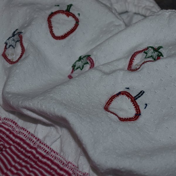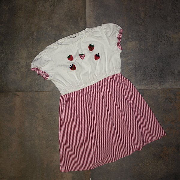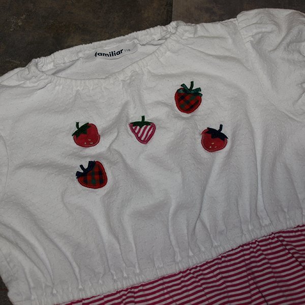 ワンピース(商品番号:127491) と共通の生地を使用しています。 上見頃には 表情のあるドビー天竺にXF(赤系チェック)やスカート部分と共通のボーダー生地を使用したいちごのアップリケ刺繍を施しました。