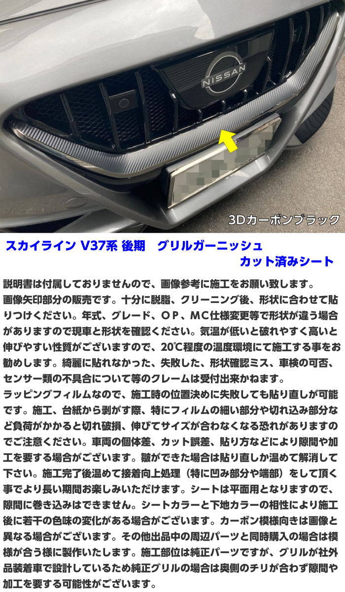 スカイラインV37系後期グリルガーニッシュカット済みシート 貼り付ける箇所メッキ部分は純正パーツですが、グリルがインパル社外品の車両で開発しているため奥側のチリが純正グリルの場合多少の隙間や加工を要する可能性がございます。 MC仕様変更やOP、グレード等で形状が異なる場合がありますので現車をご確認ください。 ★材質:PVC ★厚さ 約0.12mm~0.18mm(シート種類による) ★耐熱90度 ★屋外約2-3年(メーカー値、使用環境、シートの種類による)