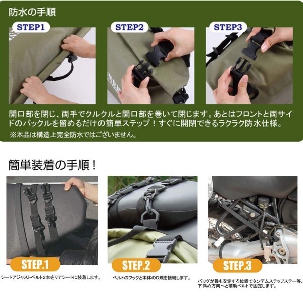 ・ 防水サイドバッグだから雨でも安心、ブラックとカーキの2色展開。 ・容量は18リットル。普段使いからツーリングまで十分な容量! ・防水バックパックにも!アジャストベルトを付け替えてバックパックとしても使用できるので便利。 ・防水は簡単3ステップ。開口部を閉じてくるくるすればOK。 ・HONDAのレブル250といった車両にもピッタリのアイテムです。 こちらの DEGNER NB-148 防水サイドバッグを ♪ 送料無料(一部地域除く) ♪ で ♪ 全国発送 ♪ 致します。 <簡単装着> ステップ1、シートアジャストベルトをリアシートに装着 ステップ2、ベルトのフックと本体のD環を接続 ステップ3、バッグが最も安定する位置で下斜め方向へと補助ベルトで固定すれば完成です。 <SPECIFICATION> ○メーカー: DEGNER(デグナー) ○モデル名: NB-148 防水サイドバッグ ○カラー: ブラック ○素材: TPU ○サイズ: 縦27×横42×幅17(cm) ○容量: 18L ○付属品: 取付共用ベルト×2,固定(補助)ベルト×2,底板 ▼定価: 6900円+消費税 | ||||