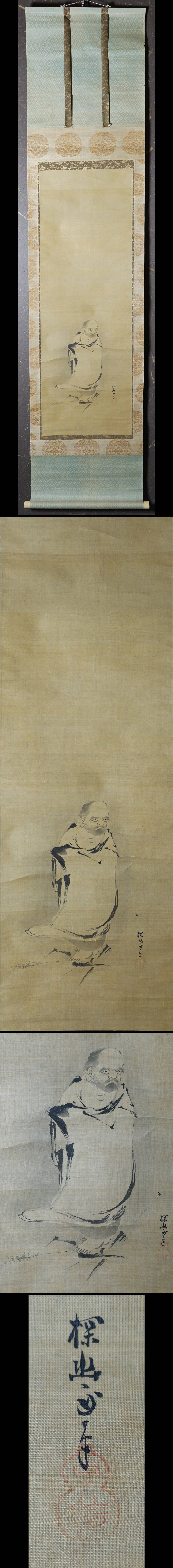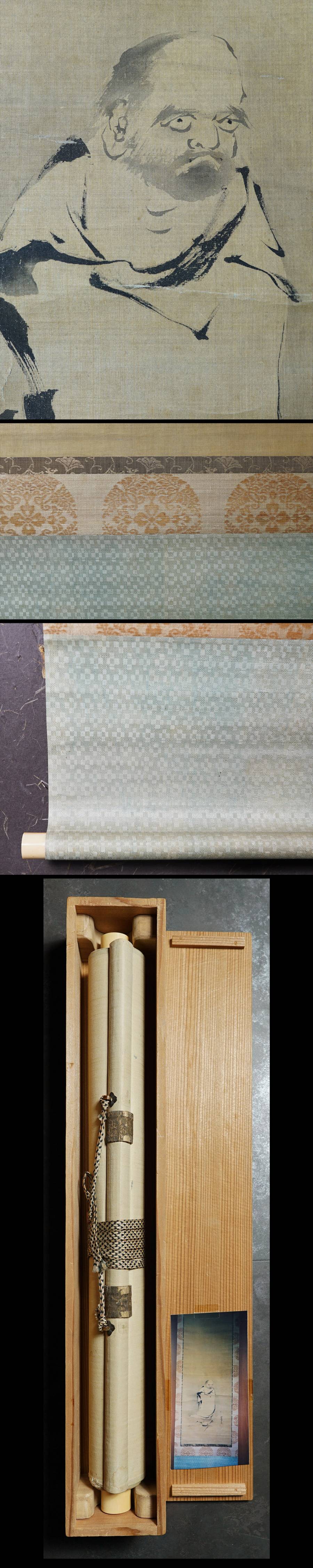 【サイズ】:表具が縦 176cm、横 40.5cm 本紙が縦 95cm、横 32.5cm 【本紙】:絹本。 【 箱 】:箱あり。 【状態】:端に虫食い、風帯に切れ目あり。本紙折れ薄い日焼けあり。 芦葉達磨は天竺(インド)からはるばる中国にやって来た達磨が梁の武帝と会見したものの、 禅の宗旨が理解されず、機縁の合わないことを知り、一茎の芦葉に乗って揚子江を渡り、 魏に入ったという説話 中国では南宋時代に芦葉達磨図が盛んに描かれ、 日本でも十三世紀後半における宋朝禅の本格的な導入に伴い、 芦葉達磨図が作られるようになる。 |