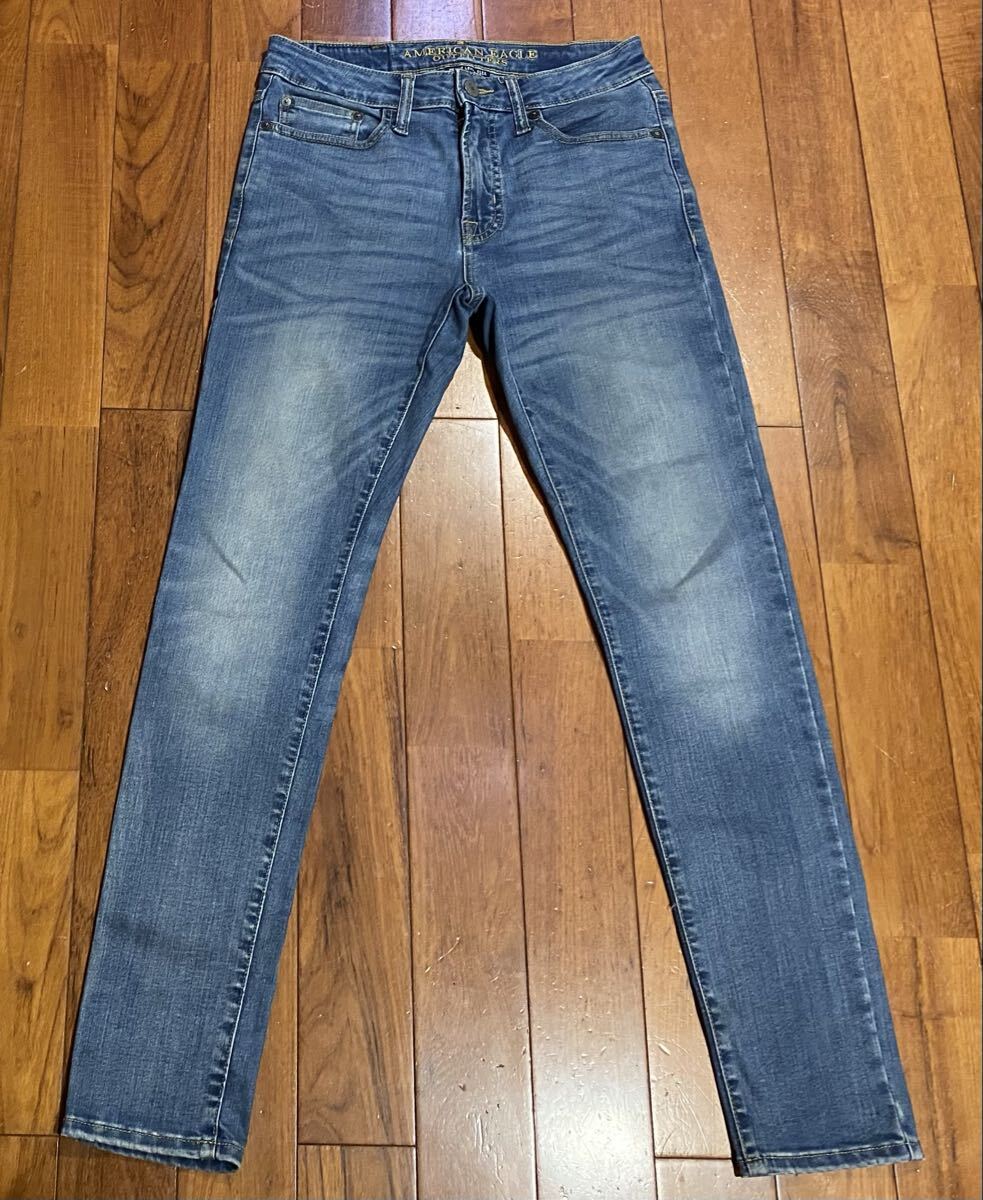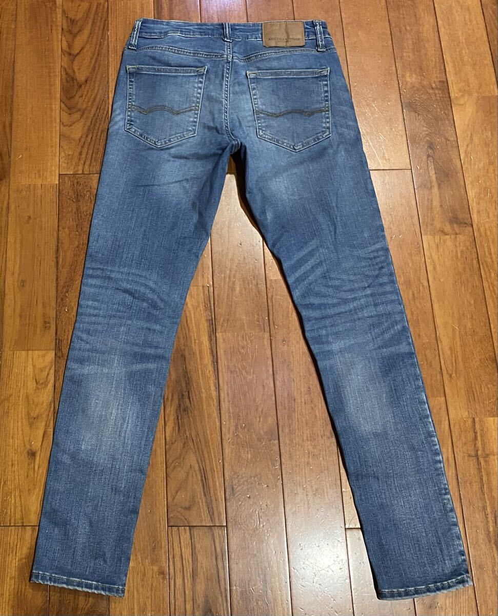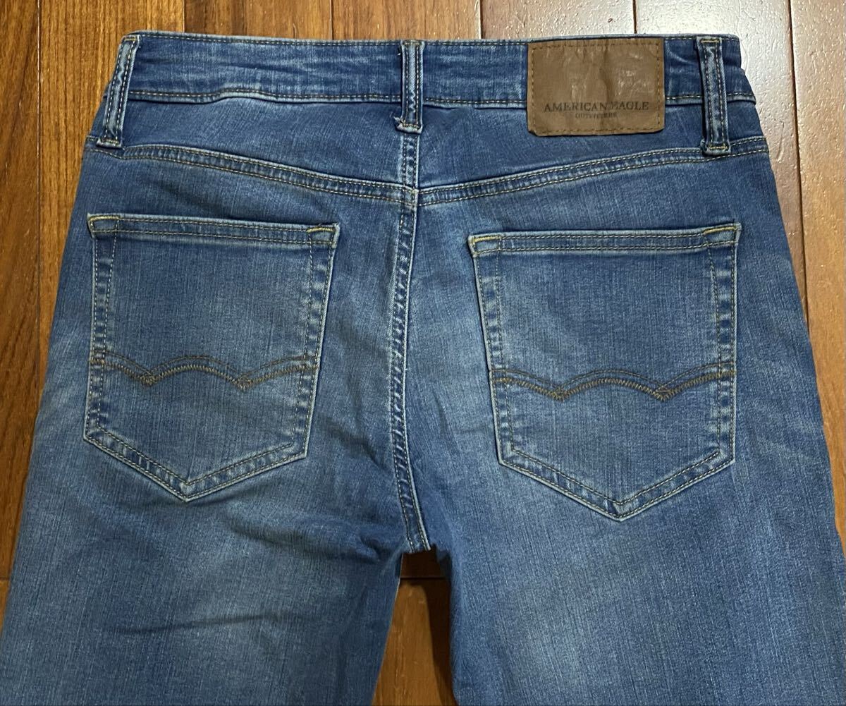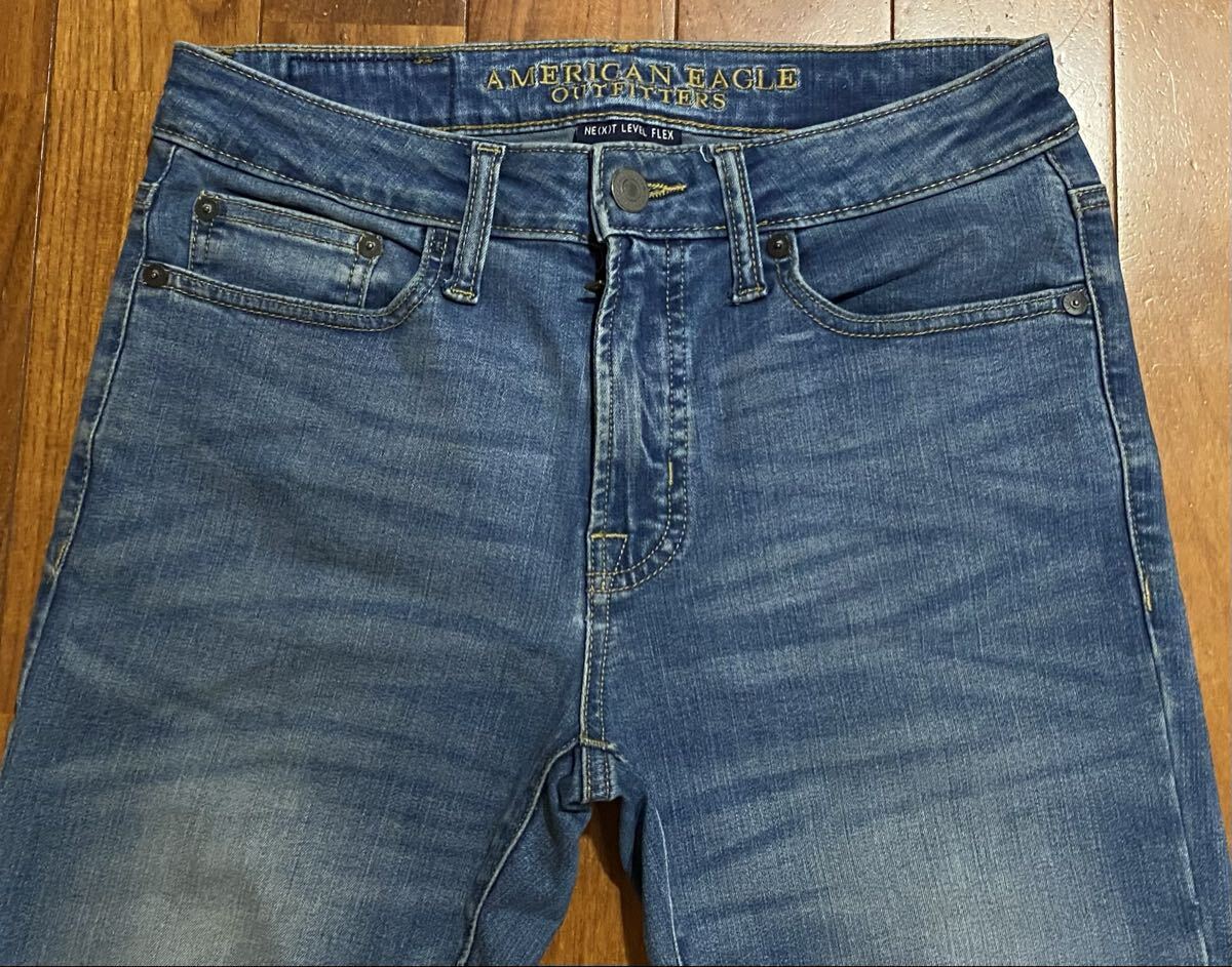 アメリカンイーグルのストレッチスキニーデニム(ジーンズ)、NE(X)T LEVEL FLEX SUPER SKINNYです。色はインディゴブルーです。USEDですが状態は良いです(10段階中8程度)。紙パッチ、ジッパーフライ、裾はチェーンステッチです。生地はストレッチ入りでコットン45%、リオセル32%、ポリエステル20%、ポリウレタン3%です。正規品です((株)イーグルリテイリング、パキスタン製)。サイズはW29×L30でウエストは重ねずに平置きで約73cm、ヒップ約92cm、股上約24cm、股下約78cm、股下15cmのふともも部分約46cm、裾まわり約28cm、重量約530gです。発送はゆうパケットポストになります。
