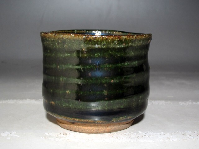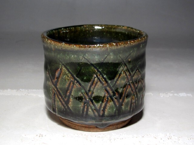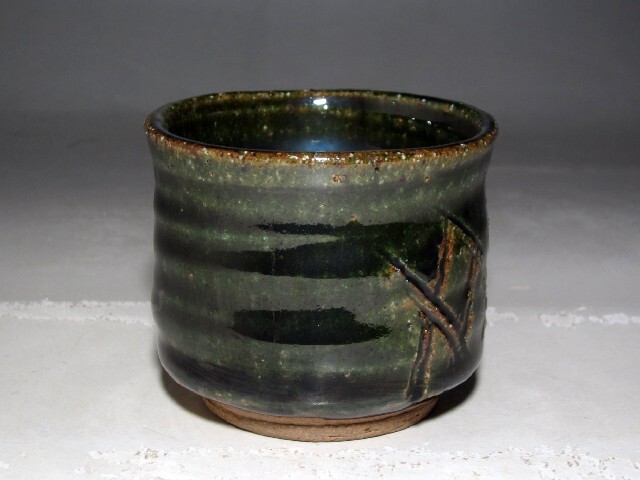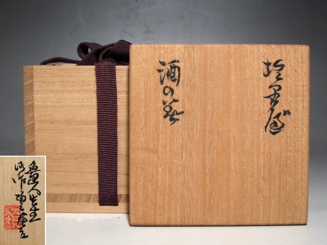 北大路魯山人作の織部盃です。 趣のある見事な出来栄えの逸品です。 箱蓋裏に黒田陶々庵の極めがあります。 【北大路魯山人(きたおおじろさんじん)1883-1959】 陶芸家。京都上賀茂出身。 近代美術史の中でも異色の芸術家で、篆刻家・画家・陶芸家・書道家・漆芸家・料理家・美食家などの様々な顔を持っている。 大正期に「美食倶楽部」「星岡茶寮」を創業し、使用するすべての食器を創案製作。以後ひたすら陶芸に没頭する。 織部焼の重要無形文化財保持者(人間国宝)に指定されるも辞退。 サイズ 直径6.5cm/高さ5.5cm(多少の誤差はお許しください) 状態 一見して疵やヒビ・直しは見られません。 骨董品という事をご勘案頂き、時代経過のスレや、小さな傷がある場合があるかもしれませんのでご承知置きください。 | |||