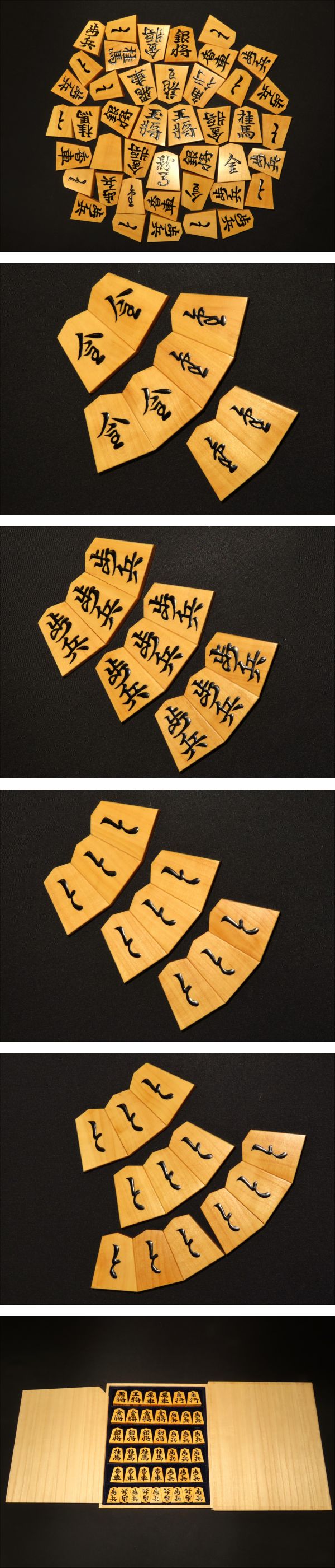 木地は御蔵島黄楊斑入上柾目。ご覧のとおり非常に味のよい木地です。全ての駒の表裏をUPいたしましたので是非ご覧ください。