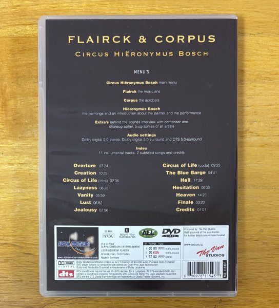 【 収録曲 】 01. Overture 7:24 02. Creation 10:25 03. Circus Of Life (Intro) 2:36 04. Lazyness 8:25 05. Vanity 5:59 06. Lust 6:52 07. Jealousy 2:56 08. Circus Of Life (Coda) 3:23 09. The Blue Barge 4:41 10. Hell 17:29 11. Hesitation 6:28 12. Heaven 14:23 13. Finale 3:20 14. Credits 1:01 ※超人的な演奏力と徹底した古楽志向/Acoustic演奏という他に例を見ない特異な音楽性を持つDutch産名バンド、同郷の演劇集団CORPUSとの'02年1月に行われた競演映像を収録した'02年Live DVDが登場!本盤は国内プレイヤーで視聴可能なNTSC盤、異端の天才画家Hieronymus Boschの絵画世界を音と演劇で再現したコラボ作で、妖しくも美しい不可思議な世界を音とパフォーマンスで見事に表現。ため息の出るような眩惑の世界が映像で堪能できる必見の一本です。映像はFLAIRCK、CORPUS、Bosch各アーティストのみの映像選択も可能、ボーナスとしてFLAIRCK/CORPUSメンバーへのインタヴューと各アーティストのヒストリー/バイオグラフィー機能を追加。 ( diskunionより ) ※本プロジェクトは作曲、総監督を担当するエリックを含めて7名のミュージシャン、さらにCORPUSとして5人のパフォーマーが参加している。今回のFLAIRCKのメンバーはエリックを筆頭にスパニッシュ・ギターのエリック・ファーソン・モレール(Eric Vaarzon Morel)、バグパイプとパーカッションのレロフ・ローゼンタール(Roelof Rosendal)が前作「Symphony For The Old World」からの継続参加。女性チェリストのマリエケ・ファン・デル・ヘイデン(Marieke van der Heyden)とアン・ファン・デン・ヒューベル(Anne van den Heuvel)、女性フルート奏者マリエル・ニーヴェニュイ (Mariëlle Nieuwenhuis)そしてアコーディオンのニハド・ルスタンベゴヴィッチ(Nihad Hrustanbegovic)の4名が今回からの新メンバーだ。ダブル・チェロというフォームは今回初めての試みである。楽曲の基盤は初期の最高傑作として名高い4作目の「Circus」(’80年)とボッシュの絵画と人生の輪廻を描いた12作目「The Parade」(’92年)の2作品で、これらの収録曲からコンセプトに見合ったレパートリーをピック・アップ。さらにテーマにトータル性を持たせるために大幅に曲を書き足し、総計90分を超える一大スペクタクルを完成させた。 ( 付属解説より抜粋 ) 【 参考映像 】 Flairck & Corpus ( circus Hiëronymus Bosch ) Live 1° parte |