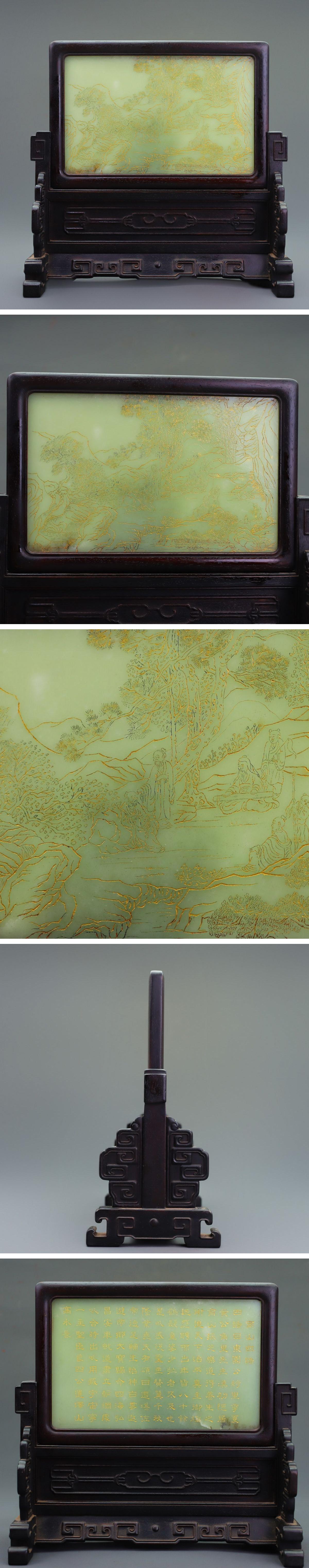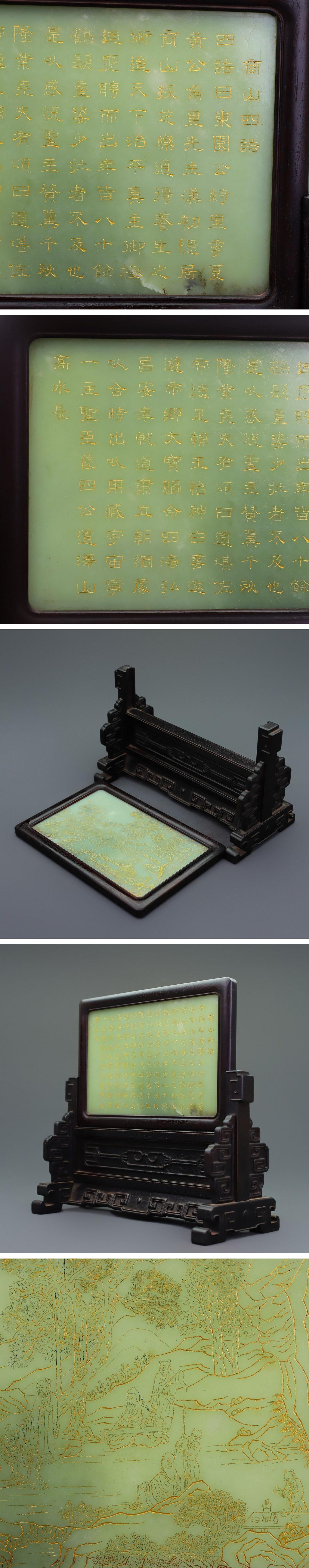 【清】某有名オークション購入 清時代 紫檀木 象嵌和田青玉 山水漢詩紋屏風 材質保証 当時物保証 古置物 古擺件 古美術 時代コレクション7L9-BF20