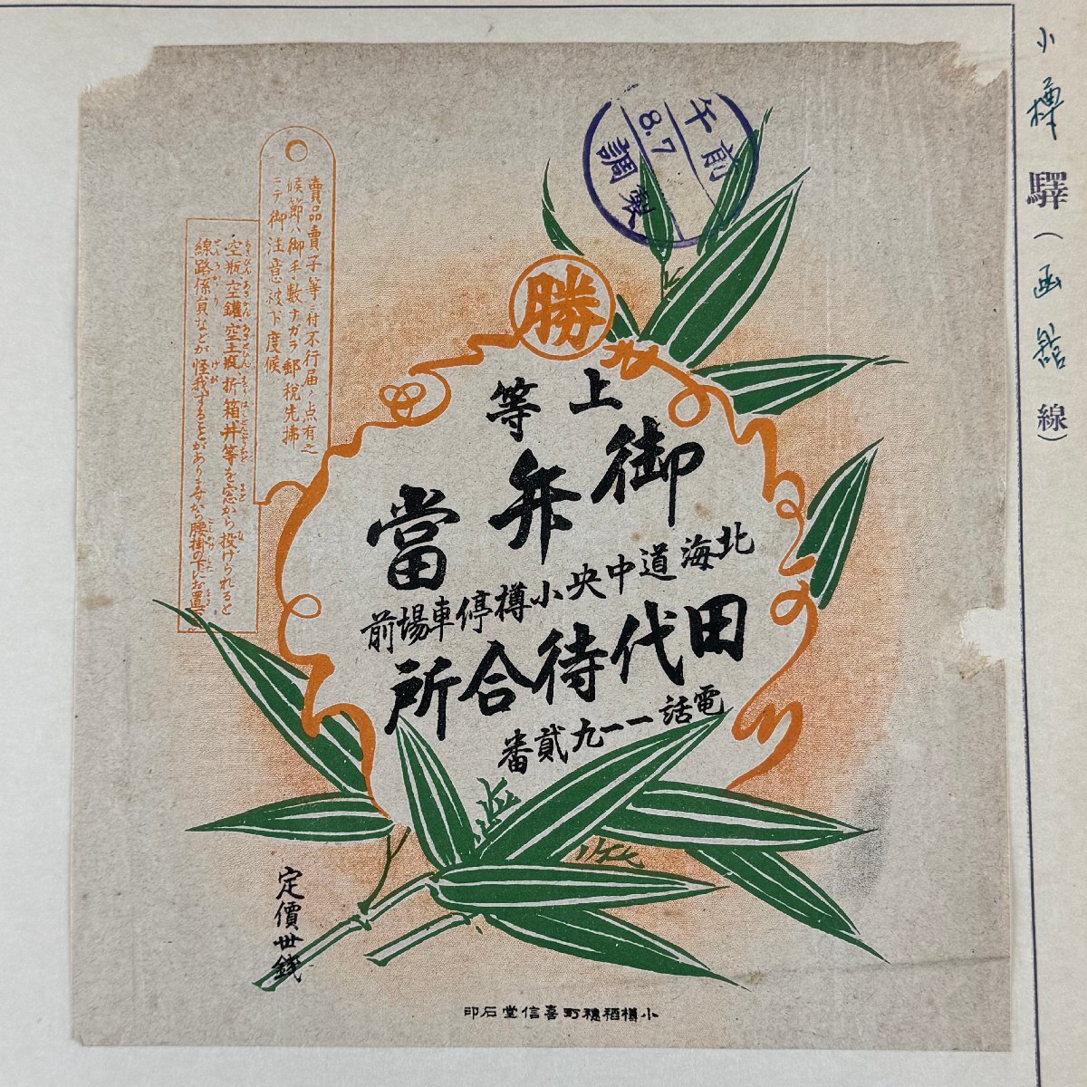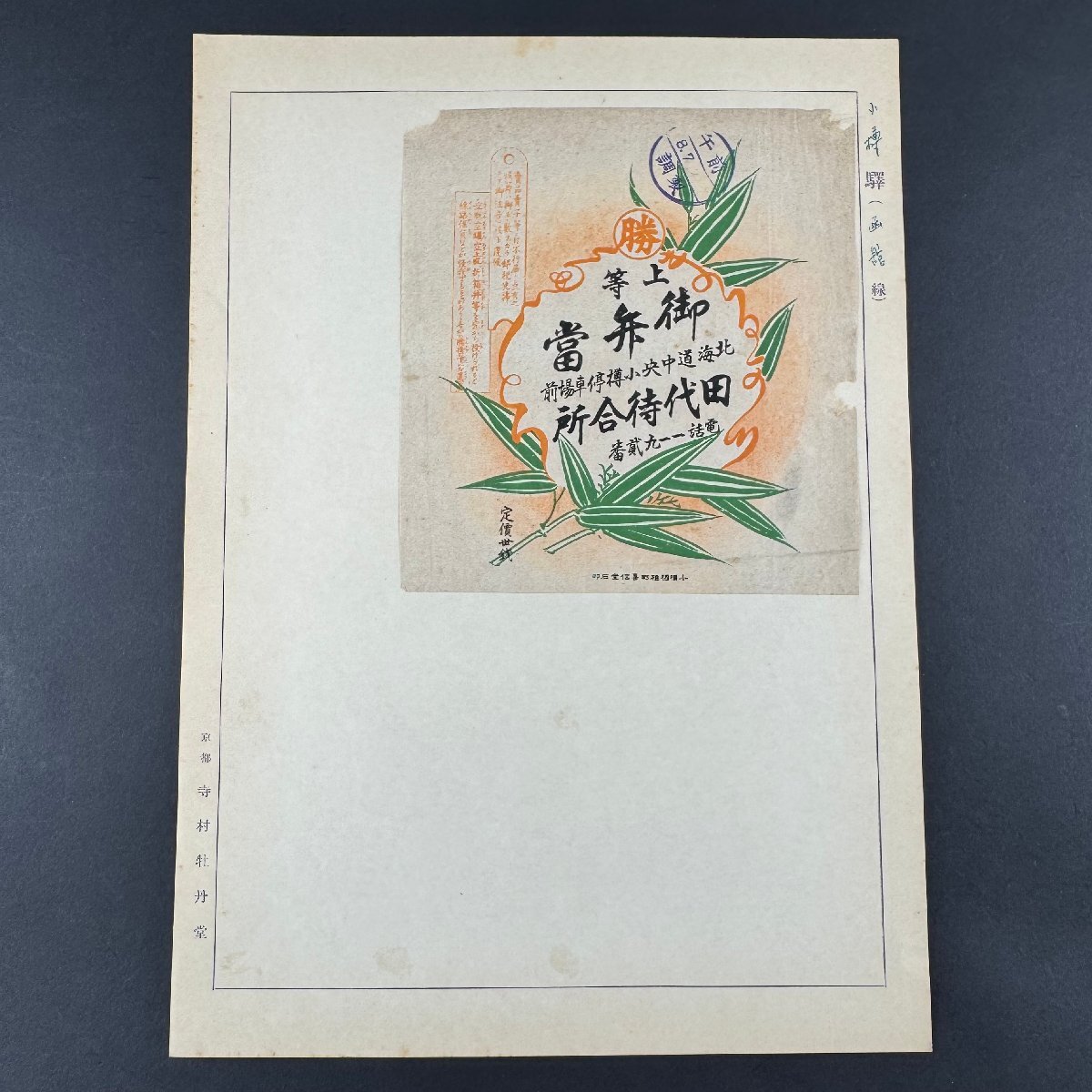 ↑こちらをタップ・クリックして、その他の出品オークションをご覧ください。 カテゴリー別に検索画像ボタンがあります。 スマホは「ストアからの案内を見る」をタップしてください。 【商品説明・状態】 掛け紙寸法 : 縦18㎝ 横17㎝ 今回、出品します駅弁の掛け紙は、戦前に集められたものです。 列車食堂や海外の駅弁の掛け紙を初めとし、北海道から鹿児島までの各駅で売られていました駅弁の掛け紙を出品致します。 かなり珍しいものもあると思います。 総数は500枚以上です。 全てを売り切りますので、どうぞよろしくお願い致します。 当時のコレクターの方が全てを台紙貼りにされています。ほとんどの物は、隅の2カ所と4カ所の角だけの糊付けです。 古いものですので、汚れや破れがございます。 ご理解の上、ご入札をお願いいたします。 【支払金額】 お支払いは、PayPay・クレジットカード払い・コンビニ払い・銀行振込(PayPay銀行・ゆうちょ銀行)となっております。 お支払いはご落札後、5日以内にお願い致します。 ※ご都合により入金や連絡が遅れる場合には事前にご連絡を下さい。 【同梱包の支払方法・取り置き期間】 ※ご注意してください。 複数ご落札予定のお客様に対しましては同梱包発送は可能です。 初めのご落札時に取引ナビの要望欄にて、必ず同梱包のご連絡をくださいませ。 ※同梱包可能の場合の「お支払いの流れ」は下記の通りです。 ■コンビニ決済の場合 1.それぞれの商品の[取引をはじめる]ボタンより取引ナビにて、購入手続きをお願い致します。 2.全落札商品の購入手続きが必要です。のシステム上、1落札分でまとめて全部のお支払いをすることはできません。 3.ご落札日の翌営業日に、当店が同梱包時の送料にお支払い金額を変更します。 4.支払い番号メールが届きましたら、お支払いにお進みください。 ■銀行振込の場合 1.それぞれの商品の[取引をはじめる]ボタンより取引ナビにて、購入手続きをお願い致します。 2.全落札商品の購入手続きが必要です。 3.最後のご落札の翌営業日に、当店が同梱包時の送料にお支払い金額を変更し、お支払い総額を記載したメールをお送り致します。 4.メールが届きましたら、お振込みをお願い致します。 お取り置き期間は初めの落札から基本7日間です。 【発送・送料】 お支払いが確認出来次第、2営業日以内に発送させていただきます。 落札物の発送は全てポリ袋・クリアファイルに入れて厚紙で補強しての発送になります。 ※基本は定形外郵便での発送になりますが、補償のあるゆうパック並びにレターパックプラスをお勧め致します。 レターパックについて https://www.post.japanpost.jp/service/letterpack/ ゆうパック送料一覧 http://www.post.japanpost.jp/service/you_pack/charge/ichiran/26.html 郵便事故などのトラブルに関しましては、一切の責任を負うことはできません。 ■定形外郵便は追跡・保証はありません。日時指定はできません。基本ポスト投函です。土日・祝日の配達はございません。 ■レターパックは追跡はありますが、保証はありません。日時指定はできません。土日配達あります。 【お願い】 完璧なものや新品のようなものをご希望の方は、ご入札をお控えくださいませ。 ご不明な点などがございましたら、お気軽にご質問・お問い合わせください。 【キャンセル】 商品説明の内容や商品画像に著しく間違いがない限り、キャンセルや返品はお受けできませんので、 説明や画像を良くご覧の上、責任のあるご入札をお願いいたします。 【取引連絡】 落札されますと ! から送られます落札の【取引ナビ】から手続きをお願いいたします。 ご落札の翌日から必ず3日以内にお願いいたします。 【落札取り消し】 ・商品ご落札の翌日から3日以内にご連絡をいただけない場合 ・ご入金が落札日より5日以内にない場合。 誠に申し訳ございませんが「落札者の都合」で落札を取り消させていただきます。 【注意事項】 ※新規IDや評価の芳しくないIDからの入札は削除する場合がございます。 ※撮影時の照明やディスプレイの機種により実際の商品と画像の色合いが若干違って見えることがございます。ご了承ください。 |