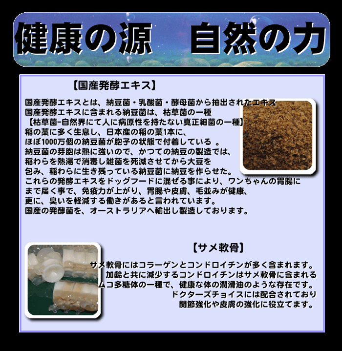 | 商品名 : DRS.CHOICE(ドクターズチョイス) ライト 6kg 【お得な送料無料商品!!】 北海道・沖縄・離島等の場合は一部送料のご負担をお願い致します。 プレミアムドッグフード(体重管理用 ライト 1歳以上 中粒 ラム&玄米) ![]() ■健康の源 自然の力・・・・・・国産醗酵エキス・サメ軟骨 ■厳選された食材・・・・・・・・・ラムミール・玄米 ■皮膚・毛並みのサポート・・・キャノーラ油・亜麻仁油・魚油・ひまわり油 ■自然派保存料使用・・・・・・・ローズマリー・ビタミンE ★★★★ DRS.CHOICE(ドクターズチョイス) ライト 成犬体重管理用 のおすすめポイント! ★★★★ 1)国産醗酵エキスにより、整腸作用、体臭、便、尿の軽減 2)サメ軟骨の成分による関節の強化 3)オメガのバランスのよい配合によりキレイな皮膚・被毛のサポート 4)食べ易く消化しやすい円盤型の粒 5)多くの固有の生物を守る為に、厳しい検疫を行っているオーストラリアにて生産しており、発注してからの生産に なる為、常により良い新鮮な物をお客様へお届けしております。 ![]() ![]() ![]() ドクターズチョイスは、粒の形状にこだわりました 犬はもともと何でも飲み込んでしまう習慣があるので、ある程度の大きさで噛ませて食べさせる必要があります。そうすることにより、消化不良などがおきにくくなり、栄養素も体に吸収されやすくなります。ドクターズチョイスは粒の形状が円盤型となっており、愛犬にとって食べ易く、噛み易い形となっております。噛む事により、脳が刺激され、発育向上を促し、消化不良を防ぎます。 ドクターズチョイスは、AAFCOとNRCの栄養基準をみたしているドッグフードです。 Association of America Food Control Official (AAFCO 米国飼料検査官協会) アメリカで厳しいドッグフード栄養基準を定めている機関です。 National Research Council (NRC 米国国家研究会議家畜栄養委員会) ・合成着色料・合成香料無添加 ・原産国 オーストラリア ![]() 主 成 分 粗タンパク質 21.0%以上 粗 脂 肪 8.0%以上 粗 繊 維 4.5%以下 灰 分 7.0%以下 水 分 10.0%以下 その他の栄養分 オメガ3脂肪酸 0.2% オメガ6脂肪酸 1.6% カルシウム 2.5%以下 320kcal/100g 原 材 料 ラムミール、米、とうもろこし、スチームオート麦、玄米、グリーンフィールド豆、コーングルテンミール、チキンダイジェスト、動物性脂肪、オメガ3&6ブレンド、ビタミンA、ビタミンD3、ビタミンE、ビタミンK3、ビタミンB1、ビタミンB2、ビタミンB3、ビタミンB5、ビタミンB6、ビタミンB12、葉酸、ビオチン、硫酸銅、銅キレート、硫酸亜鉛、亜鉛キレート、マンガン酸化物、マンガンキレート、硫酸鉄、鉄キレート、セレン、ヨウ素、カルシウム、国産発酵パウダー、サメ軟骨、酸化防止剤(ビタミンE、ローズマリー抽出物) ![]() ![]() 他のDRS.CHOICEドクターズチョイスシリーズやドッグフードも出品しておりますよ!  |