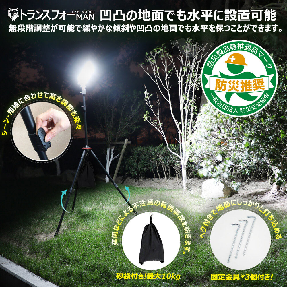 | 部品規格 | (1)ライト部:約W303*H61*D303mm | セット内容 | エリアライト付き台座、三脚(軸と脚*3本)、ACアダプター、Micro USBケーブル、固定金具*3、ストラップ、砂袋、 取扱説明書 、保証書、収納ケース |