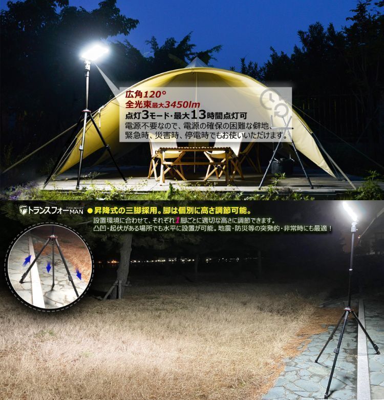 | 点灯時間 | HIGH:2時間 MIDDLE:4時間 LOW:13時間 | 照射角度 | 120°(HIGH・LOW)/15°(MIDDLE) |