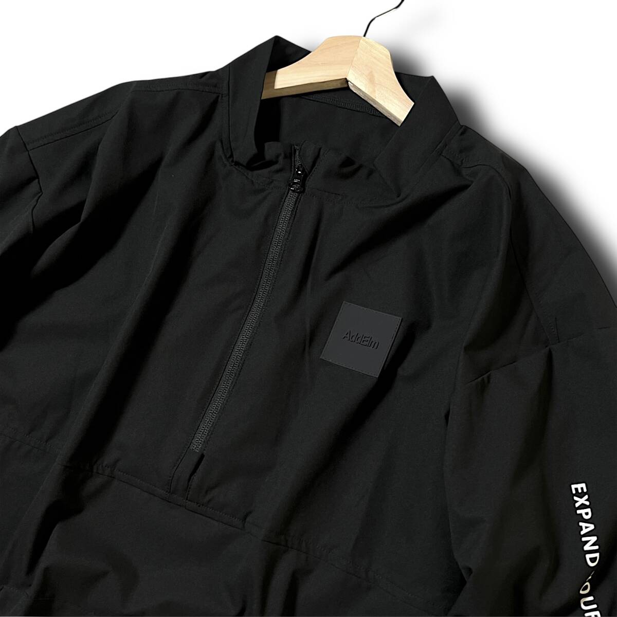 タイトル 新品 AddElm アドエルム 定価2万 日本製 Made in japan アクティブ素材 add.02 3D設計ストレッチ アノラックジャケット プルオーバー トレーニングウェア ゴルフに最適 M メンズ GOLF スポーツ レジャー アウトドア 普段使い タウンユース ブラック系