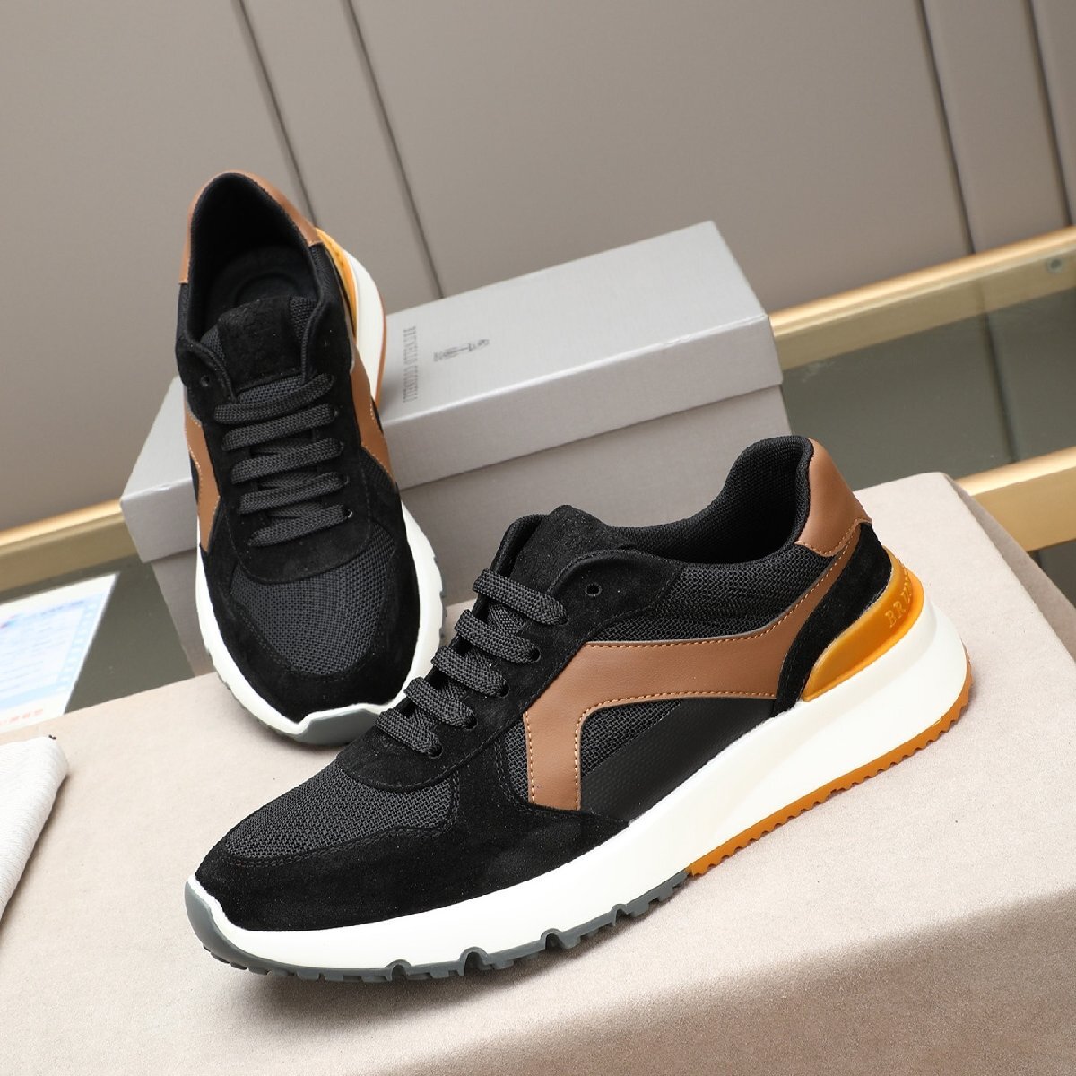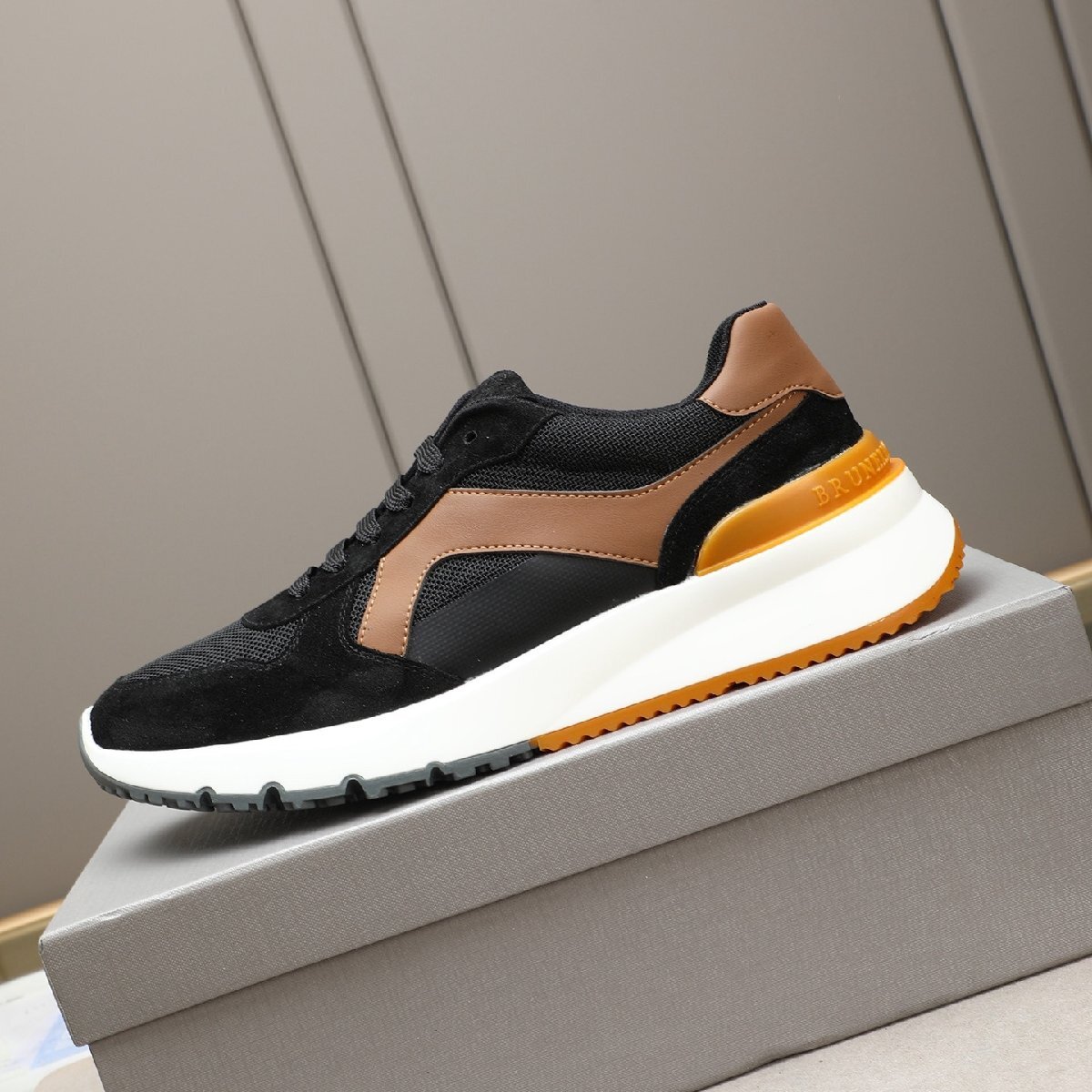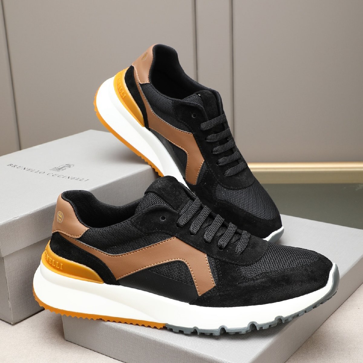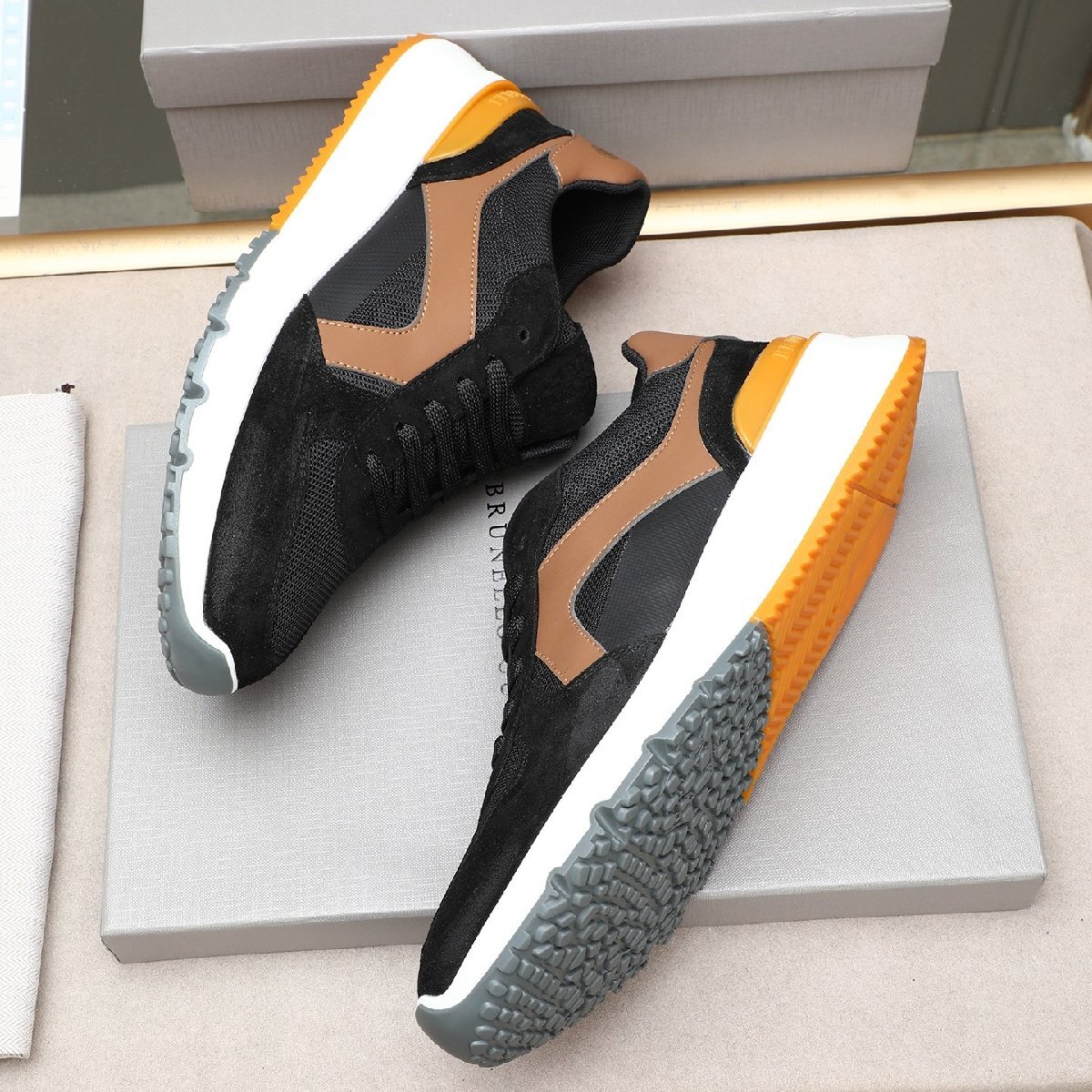 洗練されたデザインと贅沢な素材使いが特徴的なBrunello Cucinelliのスニーカー。上質なイタリア製カーフレザーとメッシュ素材を組み合わせた、スポーティーでありながらラグジュアリーな一足ですブラックをベースに、グレーとオレンジのアクセントカラーが効いた洗練されたカラーリング。通気性に優れたメッシュ素材と柔らかなカーフレザーの組み合わせで、快適な履き心地を実現。白いミッドソールとオレンジのアウトソールがモダンな印象を与え、カジュアルからスマートカジュアルまで幅広いスタイリングに対応。TPU素材の一体成型ソールは耐久性に優れ、安定した歩行をサポート。イタリアならではの職人技が光る、細部まで丁寧に作り込まれたプレミアムスニーカーです。
