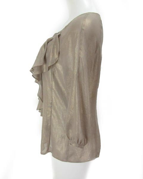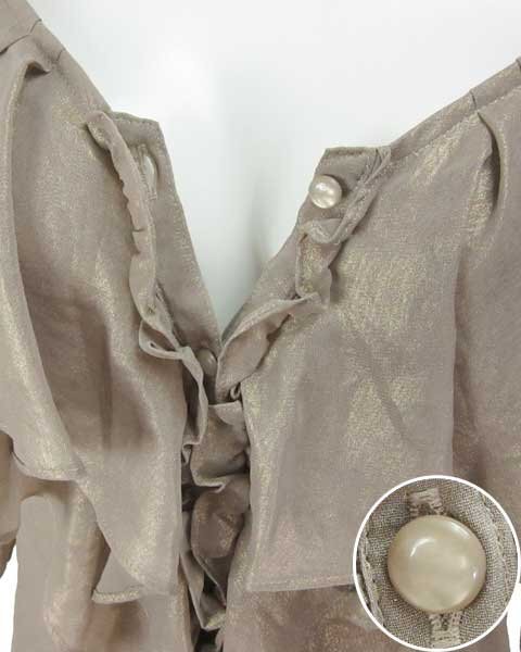 | 胸元にフリルいっぱいの大人シアーブラウス。グレージュにゴールドがのっていて、光の加減でゴールドがみえて華やかな雰囲気になります。華やかなシーンや夜のお出かけなどでいかがでしょうか。 |