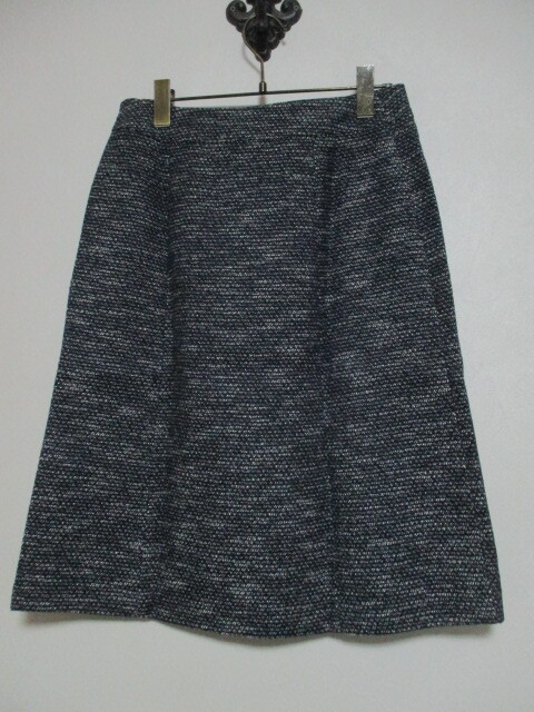 | 商品紹介 | ネイビーと白の糸が混ざった膝下丈のスカートです。 ツイードのような素材感です。 平置きにすると台形のような形です。 ウエスト左側に脱着用のファスナーが付いています。 《素材》 表地:麻52% 綿40% ポリエステル8% 裏地:キュプラ ※割合の記載なし |