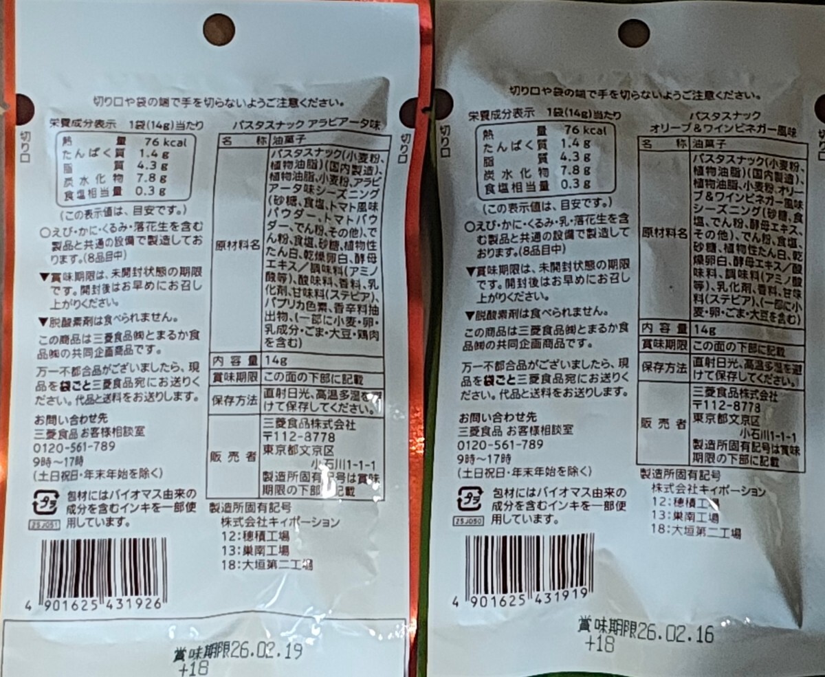 - 賞味期限: アラビアータ味 2026年2月19日、オリーブ&ワインビネガー風味 2026年2月16日