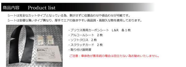 | ・プリウス専用 カーボンシート L &R 各1枚 ・取り付け説明書 ・アルコールシート2個 ・ソフトクロス ・スクラッチカード |