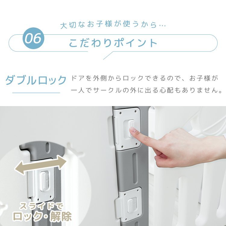| お子様に安全な軽くて柔らかい素材と丸みを帯びたデザイン! ママにも簡単に組み立てられるベビーサークルです。 赤ちゃんの脳の発達を助けるトイパネルも付いています。 工具不要で組み立て簡単! お好みの形に広げて接続部分のキャップを締めて固定するだけ! 最大スペース約133cm×133cmで広々と遊べます。 外側から扉をロックすることができるので お子様が勝手に外へ出てしまう危険性がありません。 お手入れはサッと拭くだけ! 組み立てたまま拭けるのでお手入れも簡単! いつでも清潔を保てます。 【商品仕様】 内容:パネル ×10 (おもちゃパネル×1、扉パネル×1、パネル×8) サイズ:最大スペース(約)133cm×133cm×高さ60cm 素材ポリエチレン 【カラー】 ・グレー×ホワイト |