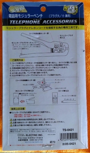 | 商品説明 | ●本商品は、自宅・家庭用電話機のコード長を調整する際に 「コードの切断、被覆の剥ぎ取り、モジュラープラグの圧着」に使用した 「OHM製/電話用モジュラーペンチ(プラ製、白)の中古・長期保管品」 です。 ●10回程度の使用後、倉庫にて長期保管していた商品で 「プラ部のスレ、汚れ」「モジュラープラグ小用アタッチメントの紛失」 「購入時の包装台紙の廃棄」は有るものの 「刃の切断、バネの伸縮、通常サイズのプラグ圧着は問題無い」様です。 注)写真③~⑥の手順で「試しの圧着」を行いました。 ●これから電話機のコード長を調整、通常サイズのプラグ圧着が必要な方に 如何でしょうか?。 【商品情報】 ①メーカー :OHM ②品 名:電話用モジュラーペンチ(プラグ大・小兼用) ※型番/TS-0421 ※本文記載の通り「小プラグ用のアタッチメントは紛失」 しています。 ※掲載写真⑦⑨参照 ③適応プラグ:6極4芯、6極2芯 ④定 価:通販価格 1,000~1,500円程度 |