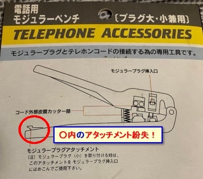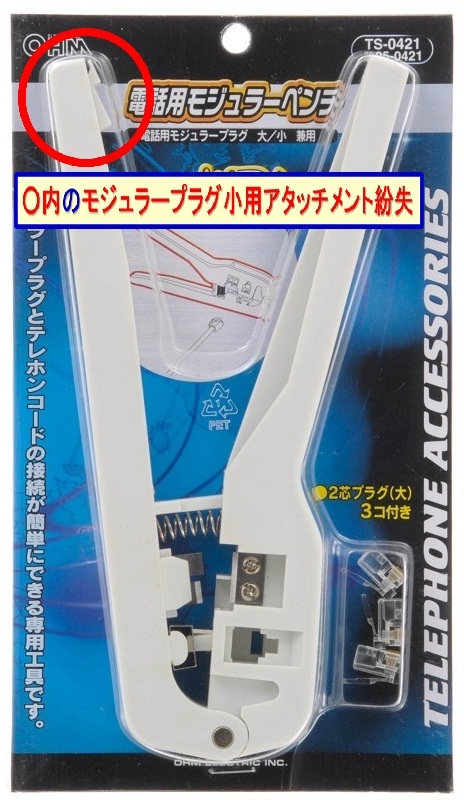 | 注意事項 | ●「小プラグ用のアタッチメントは紛失」していますが 掲載写真の通り「一般家庭用に対応した通常サイズのプラグの圧着は可能」 です。 ●「購入時の包装台紙は廃棄」していますので付属しません。 注)写真⑦~⑩は参考のため「同等品のイメージを引用」掲載しています。 ●「モジュラープラグは付属しません」ので別途、ご準備下さい。 ●商品は、現状渡しです。 「受取後のクレームや返品」にはお答えできませんので ご了解頂ける方のみのご入札をお願い致します。 |