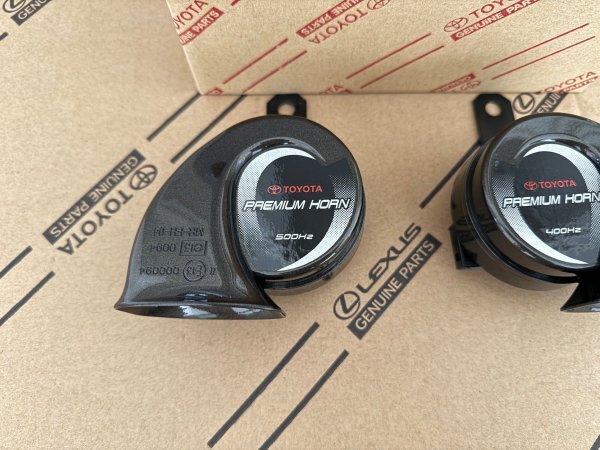 | 商品説明 | 商品説明 250系ランドクルーザーは、コスト削減の影響なのか、軽自動車に付いているようなブザータイプのホーンが付いています。 とても500万クラスの車両には不釣り合いです。 このプレミアムホーンに交換することにより、高級車と同じホーンを手に入れることが出来ます。 トヨタ純正品のため高品質な商品となっております。 取付方法は、ラジエータグリル上部のカバーを外していただき、既存のホーンと取り替えるだけです。 カプラーオンで取付可能です。 ※ホーン装着時にホーン裏側のネジ類は一切扱わないようにご注意願います。 扱ってしまうとホーンが鳴らなくなったり、音がおかしくなってしまいます。 ホーン本体はツヤ有りのガンメタ塗装が施工されており大変高級感があります。 レクサスホーンよりかっこ良いと思います。 適合車両 250系ランドクルーザー 全グレード |