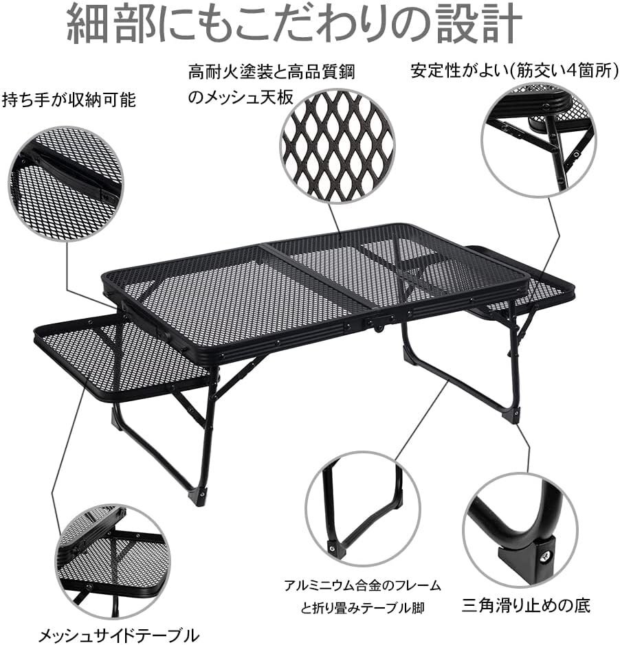 キャンプ テーブル メッシュ サイドテーブル付き アウトドア 軽量 折り畳み コンパクト 耐熱 焚き火 BBQ 登山 アルミ 携帯便利 収納袋付き