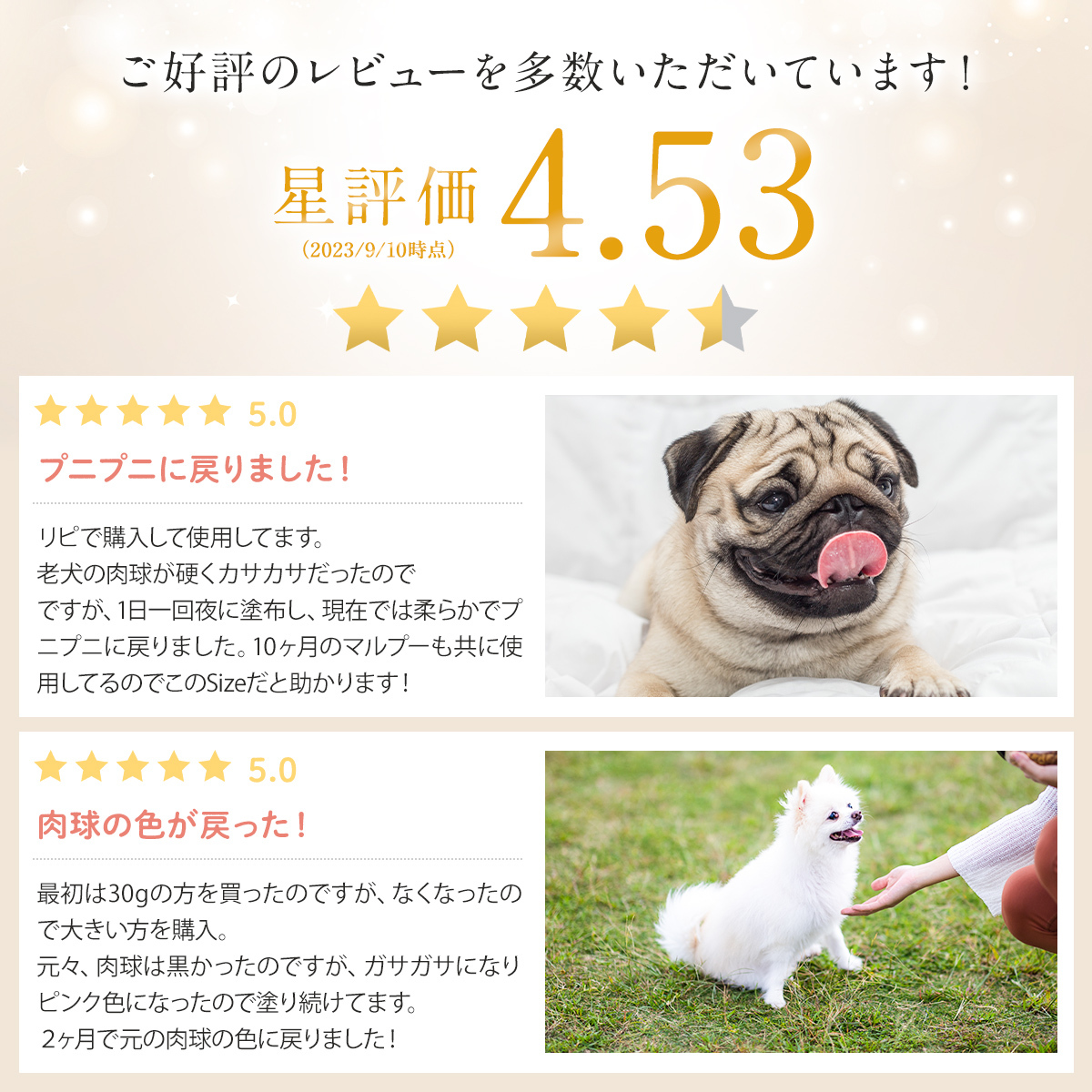 | 使用方法 | 1.使用前に埃や汚れを綺麗に取り除いてください。2.適量を取り、肉球に優しく塗布してください。 |