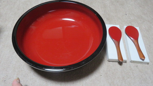 木製、漆塗り、しゃもじ2枚付きです。