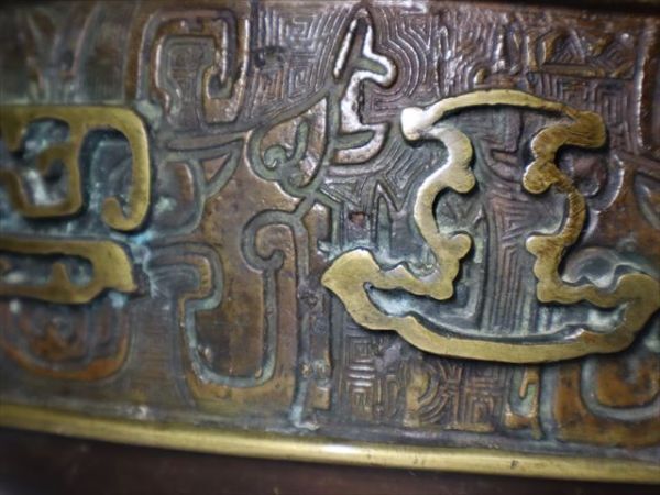 唐物黄銅鼎形火鉢 「大明宣徳」在銘です。古作のため経年による緑青、スレ、汚れなどは見られますが、全体的には状態良好です。