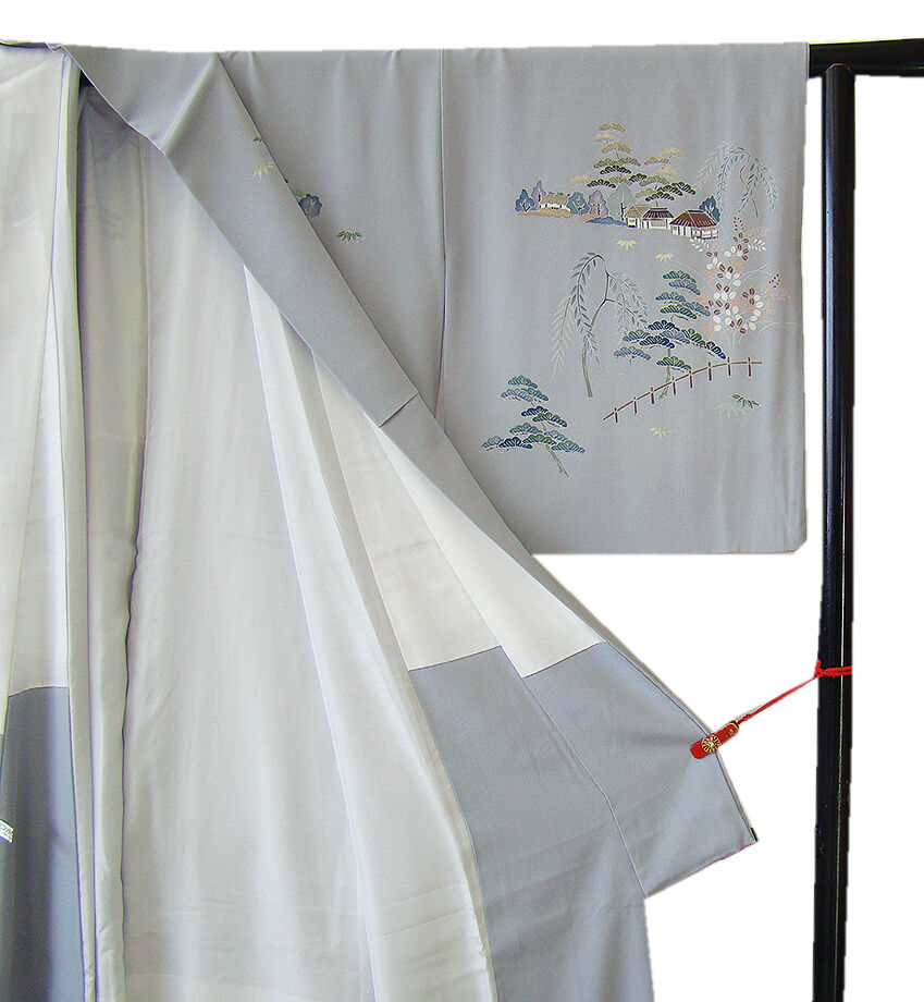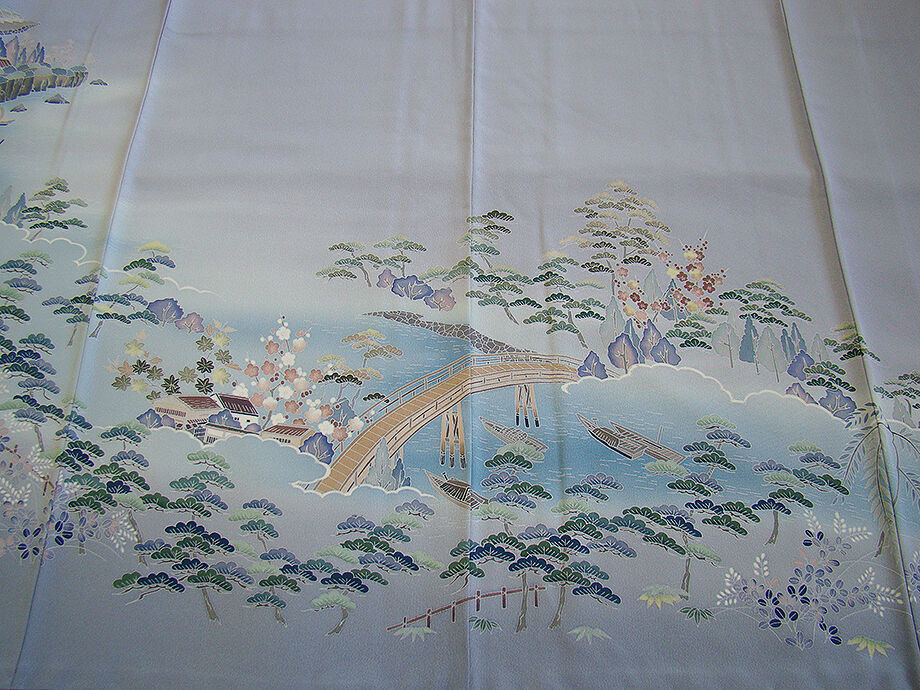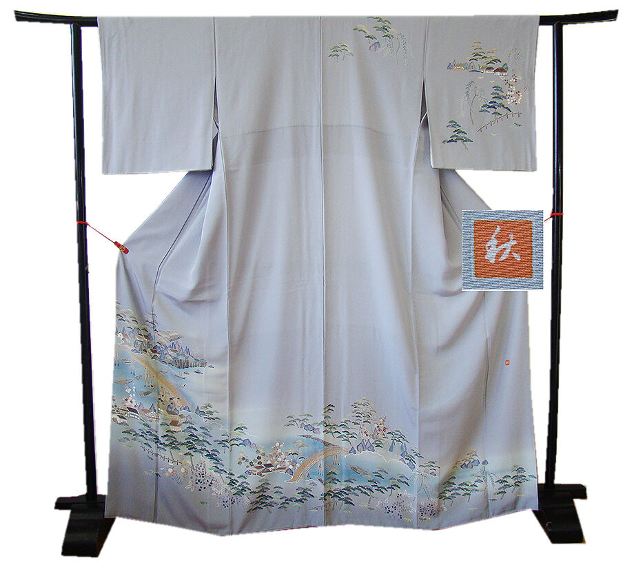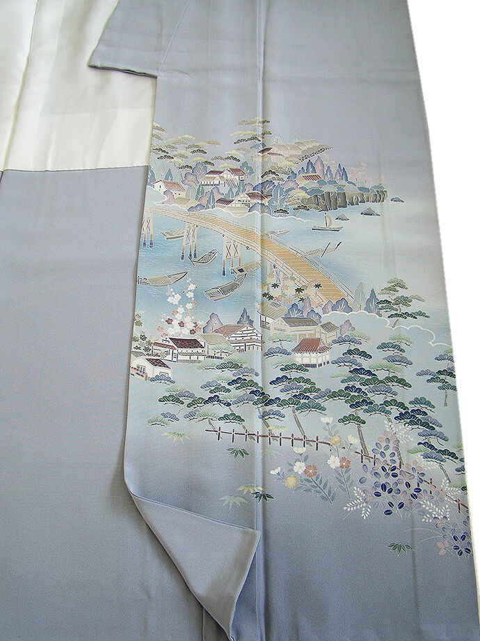 | 商品説明 | こちらのお品は「袷」ですので10月から5月までお召頂ければと思います。 とてもしなやかで柔らかな手触りの着心地良い重めの極上ちりめん地の生地、 淡藤色地に裾にかけて灰青色ぼかしに松竹梅、花草、船、立木、橋、家屋等の染柄、 気品に満ち溢れた彩りが正統派のお着物として一枚は欲しい逸品の素敵なお着物です。 八掛は共布に柄入り(正絹)、作家の落款入り、幅広い年代の方にお召頂けます。 |