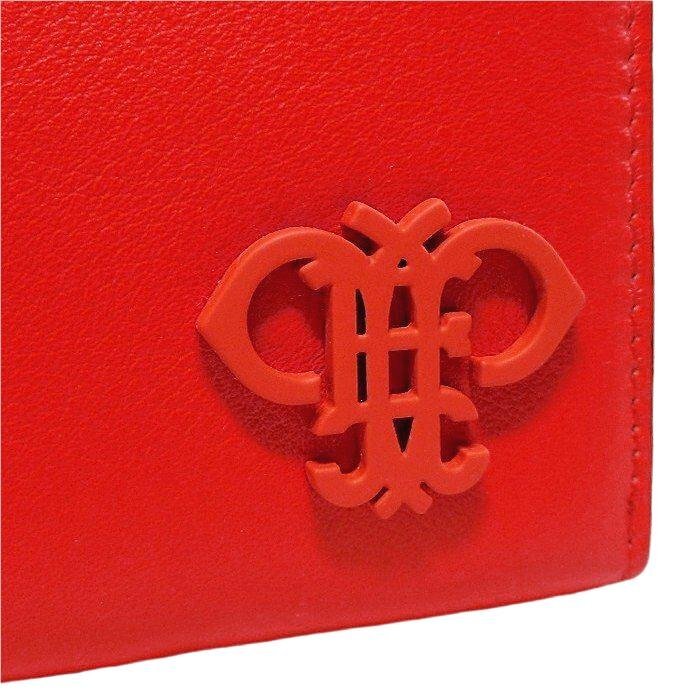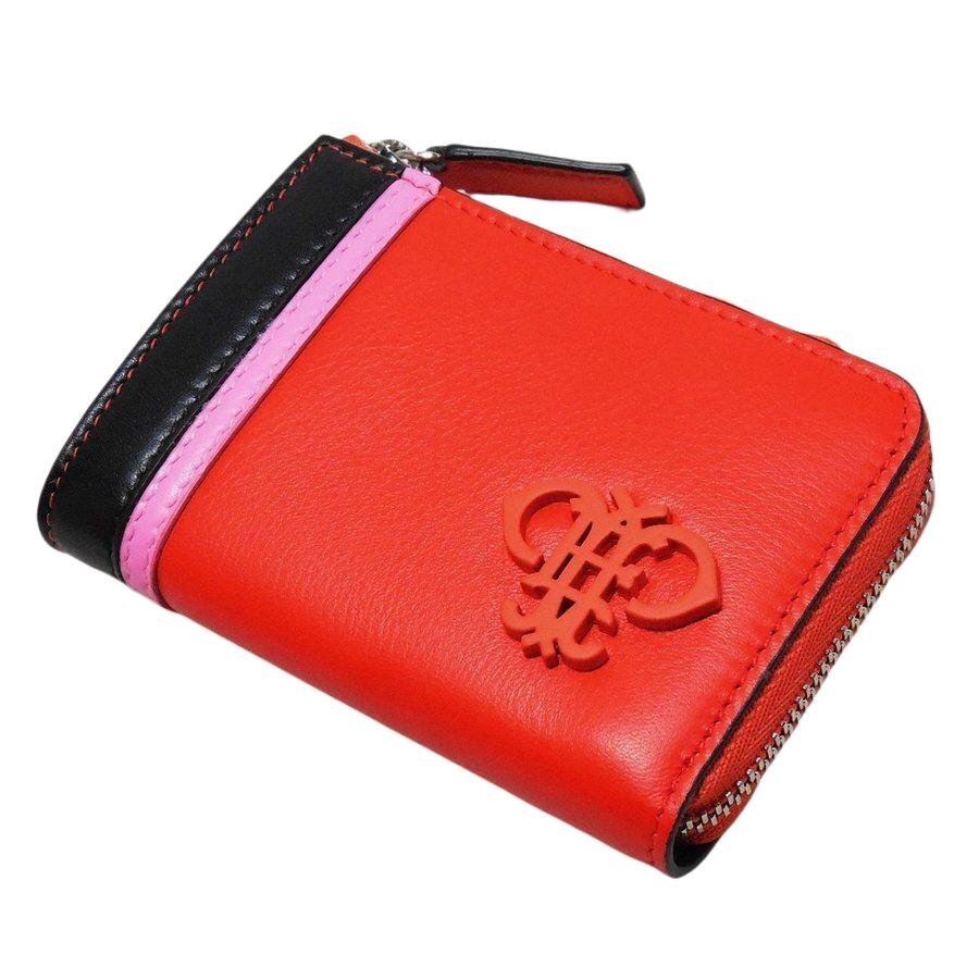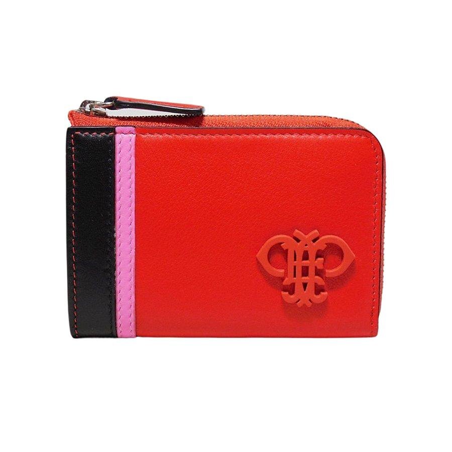 | 素材、カラー | 表地はカーフレザー100%、カラーはレッド/ピンク/ブラックのトリコロール、内側にヒートエンボス加工によるロゴ、裏地はレーヨン100%、銀色の金具 |