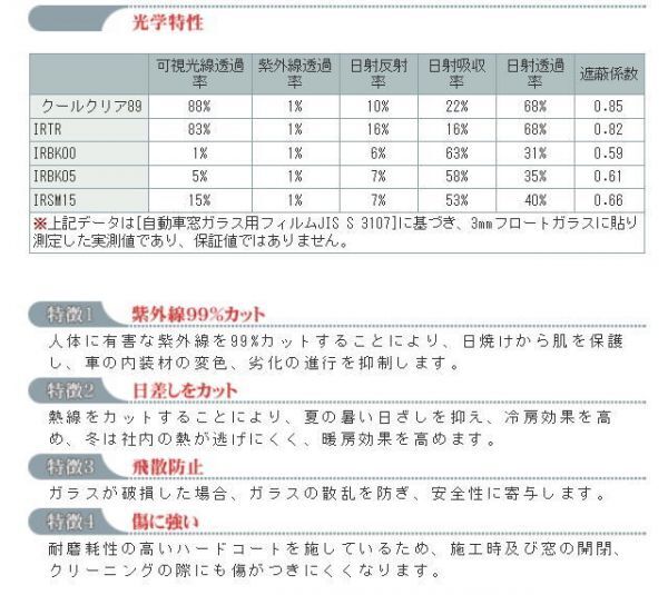 透過率等のデータは[自動車窓ガラス用フィルムJIS S 3107]に基づき、