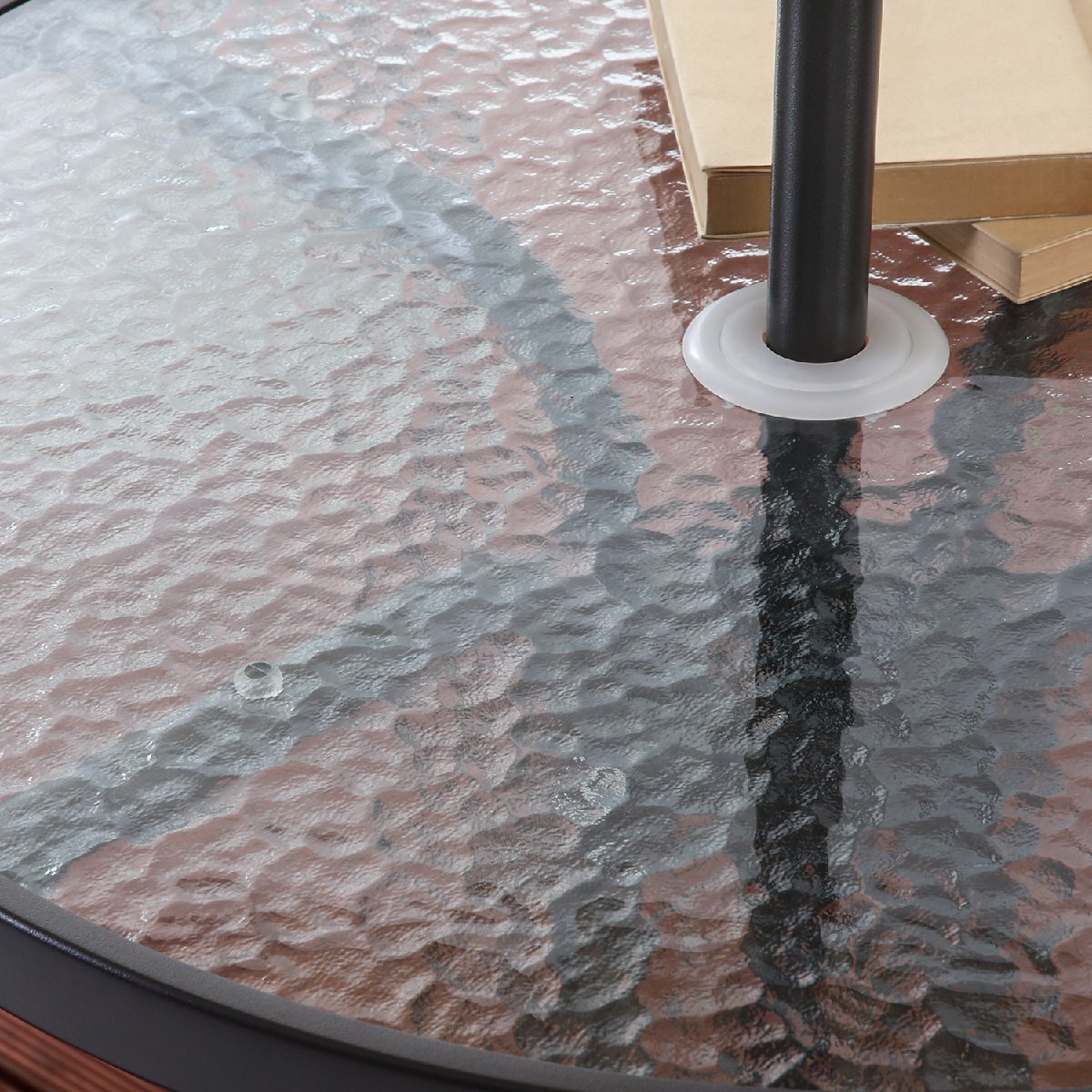 | 素 材 | □テーブル [■甲板の表面材:ガラス(波形ガラス) ■構造部材:金属(鋼) ■表面加工:エポキシ樹脂塗装] □チェアー [■構造部材:金属(鋼) ■表面加工:エポキシ樹脂塗装 ■張り材:テキストレイン(PVC75%/ポリエステル25%)] □パラソル [■構造部材:金属(鋼) ■表面加工:エポキシ樹脂塗装 ■張り材:ポリエステル] |