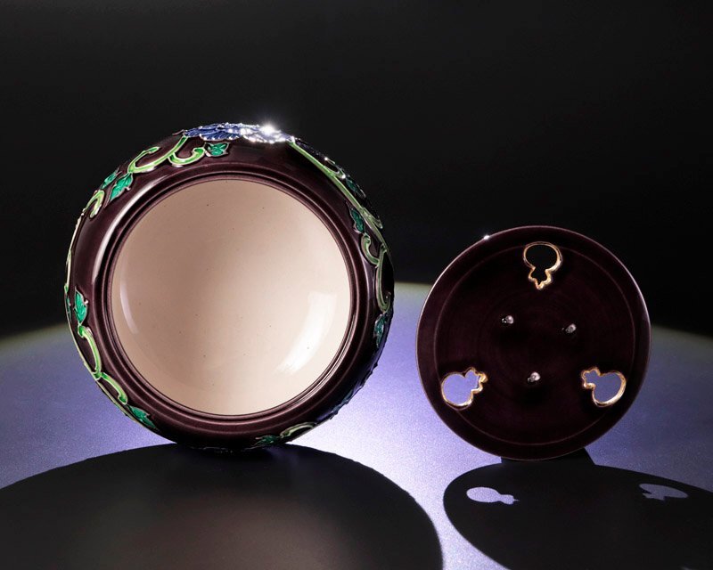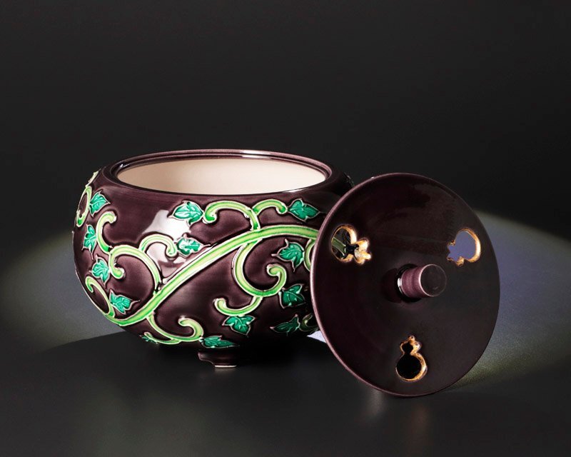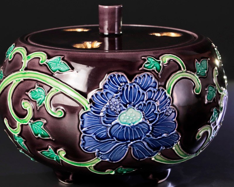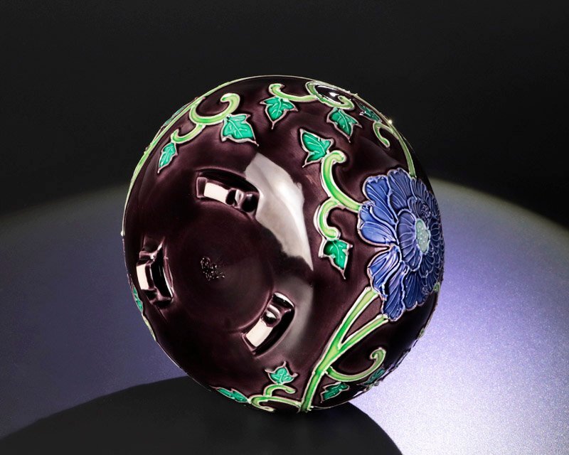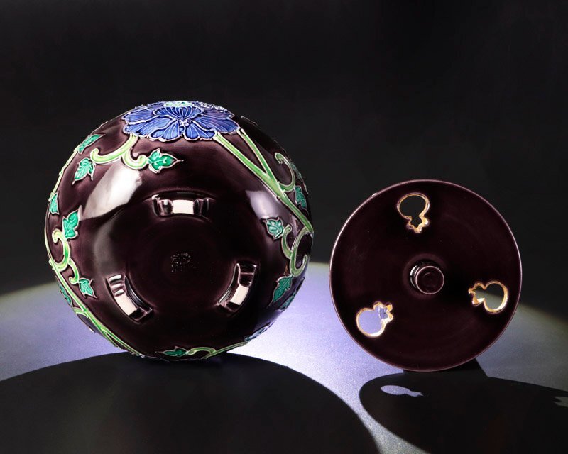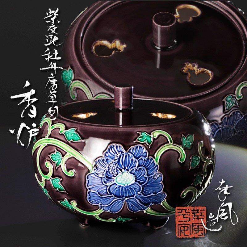 紫の肌に青い牡丹と唐草文が調和し、可憐な姿に気品が宿る香炉です。端正な造形と美しい彩りが魅力です。 ★商品は曽根幸風の作品である事を保証致します。 |