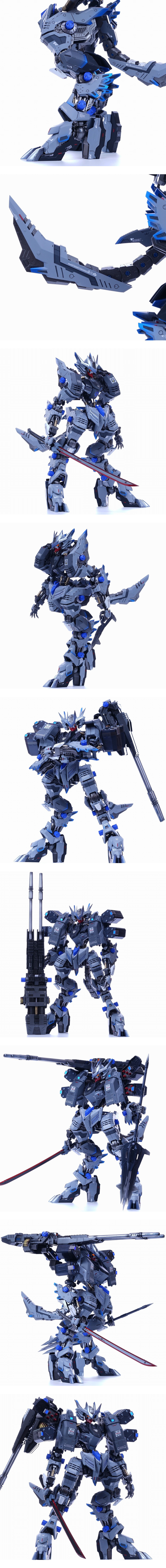 MGガンダムバルバトスをベースにFMバルバトスルプスレクスとHMMケーニッヒウルフでミキシング改修・全塗装で作成しました。 ※twitterに改修過程や他作品の写真もございますので、宜しければご参照下さい。 https://twitter.com/y0kJIfDsBheOu8Q/ 【改修内容】 ・頭部はFMバルバトスルプスレクスの物に変更し、首をそれぞれ1.5mm延長+ディテール追加しています。 ・胸部は5mm延長し、第6形態のアーマーを取付けられるように変更しています。 ・腰部は2mm延長し、股関節を独自機構のものに変更しています。 ・肩部はノーマル形態とアサルト形態に変更可能です。 ・腕はケーニッヒウルフの前腕をベースに関節周りを変更しています。 ・下半身はHMMケーニッヒウルフに変更し、装備の追加や 他キットを使用してディテールアップしています。 ・バックパックはデュアルスナイパーライフルをベースにアーム周りを改造しています。 ・全体的に様々なスケール・機種のキットやスジボリを追加してディテールアップしています。 ・各所には蛍光レッドに塗装したプラチップを配置+グラデーション塗装を施しています。 また各所スジボリの彫り直し、各部のエッジ出し、プラチップの追加など 基本工作と改修を行い、全体の情報バランスに注意しながら作成しています。 【作業工程】 ・耐水ペーパー400~1000番で各パーツのヒケ処理、エッジの鋭角化、クリアランス処理 ・パーツ洗浄→サーフェイサー→塗装→スミ入れ→デカール→トップコート 【使用塗料】 ガイア:G、フィニッシャーズ:F、クレオス:C ・Exホワイト(G) ・アイスコバルトブルー(G) ・ヘキサグレー(G) ・アーマーグレー(G) ・プライマリーメタリックブルー(G) ・オーラパールシルバー(G) ・フレームメタリックⅠ(G) ・フレームメタリックⅡ(G) ・スターブライトアイアン(G) ・スターブライトゴールド(G) ・ブレードシルバー(G) ・蛍光ブルー(G) ・蛍光レッド(G) ・蛍光オレンジ(G) ・ディープレッド(F) ・カーボンブラックマット(F) ・エンジンカッパー(F) ・グレーFS36270(C) ・スーパーリッチゴールド(C) ・スーパーファインシルバー2(C) ・黒鉄色(C) ・パーカーガンメタリック(C) ・ガンブルーメタリック(C) ・GXアイスシルバー(C) 【付属品】 ・説明書 ・各種マニピュレーター ・専用太刀 ・専用メイス ・アクションベース接続用パーツ | ||||