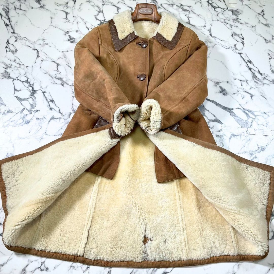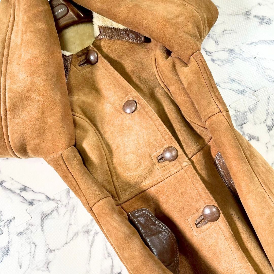 サイズはL相当。ボリュームのあるムートンながら、肩や身幅に過度な重さを感じさせず、厚手のニットの上からでも自然に羽織れるフィット感です。ランチコートらしい素朴な風合いと、ステンカラーの端正さが共存し、デイリーから冬のアウトドアシーンまで幅広く活躍します。