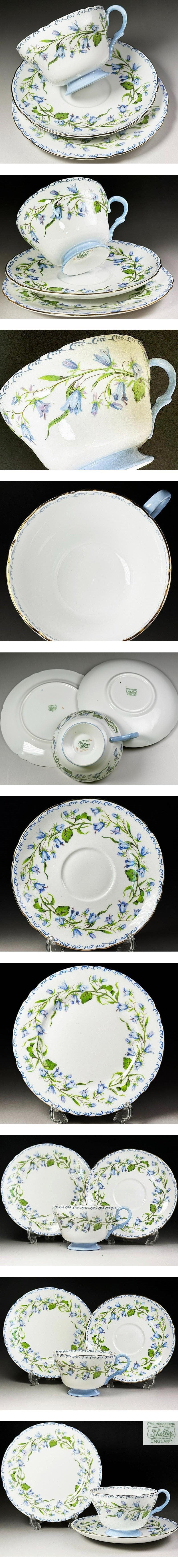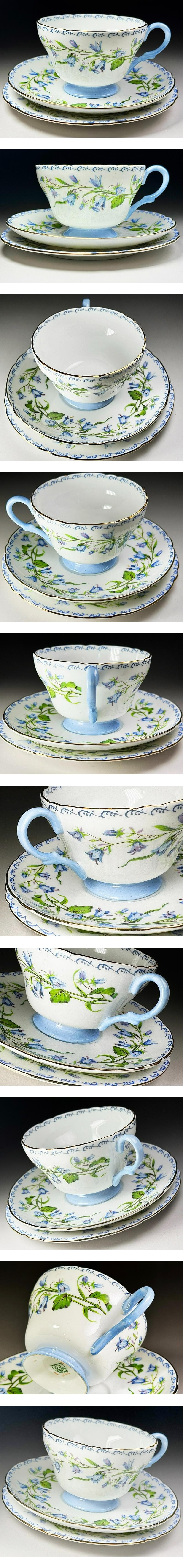 ご覧いただきありがとうございます。 【サイズ】 カップ 口径9㎝ 高さ6.2㎝ ソーサー 直径14.3㎝ プレート 直径15㎝ 【年代】1945 - 1966頃 【コンディション】 経年・使用に伴う軽いスレ傷や絵部のかすれがある程度で、ワレ・カケ等はありません。 縁の金の状態も良く全体に光沢もあり、コンディションは大変良好です。 【商品説明】 パターンナンバー13544 “ヘアベル”(Harebell)。 小さな鈴のように咲くベルフラワーが器全体に細やかに描かれ、リムには可憐な花のモチーフが上品にあしらわれています。 紫みを帯びたブルーの花色と瑞々しい葉のグリーンは爽やかに調和し ハンドルに添えられた淡いパステルブルーも柔らかなアクセントに。 こちらはヘアベルの中でも金で縁取りされているタイプ。 金彩がデザイン全体を引き締め、よりエレガントで上質な印象を与えています。 Shelleyならではの優しい色彩と華やかさを堪能できる、私自身も大好きなシリーズのひとつです。 コレクションの一品や特別なティータイムの演出に。ぜひおすすめいたします。 ■こちらは複数在庫がございます。ご希望の場合は質問欄にてお知らせ下さい。 出品中のシェリーはこちらをクリック | |||