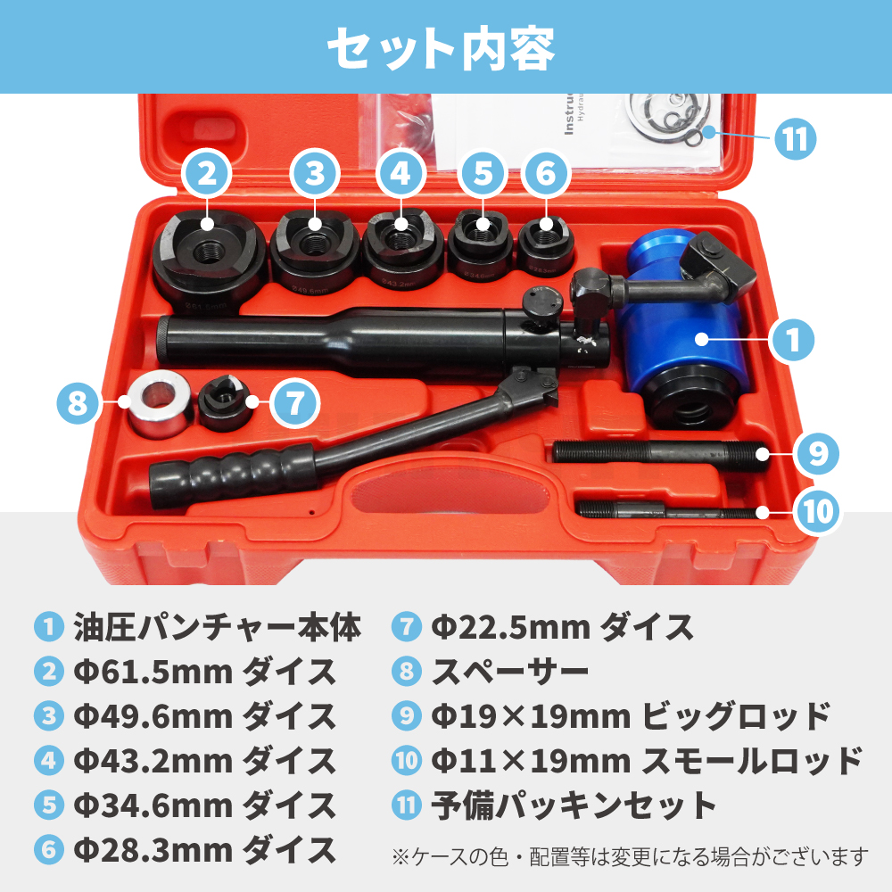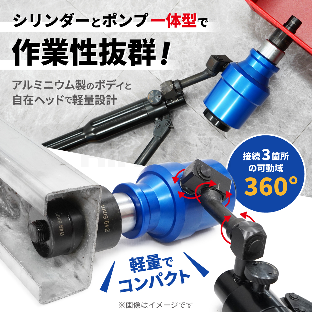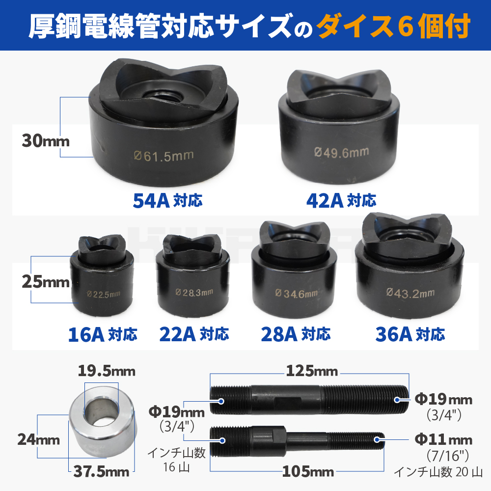 油圧の力で素早く楽にきれいに穴あけできる! ●コンパクトなボディーにアルミヘッドの採用で軽量設計、シリンダーと油圧ポンプ一体型で抜群の作業性!! ●本体とヘッドの間の接続部3ヶ所が各360°回転するのでヘッドはあらゆる方向に自在に動き様々な場所での作業が可能となります ●ダイスは厚鋼電線管用ダイス6個セットが付属します |