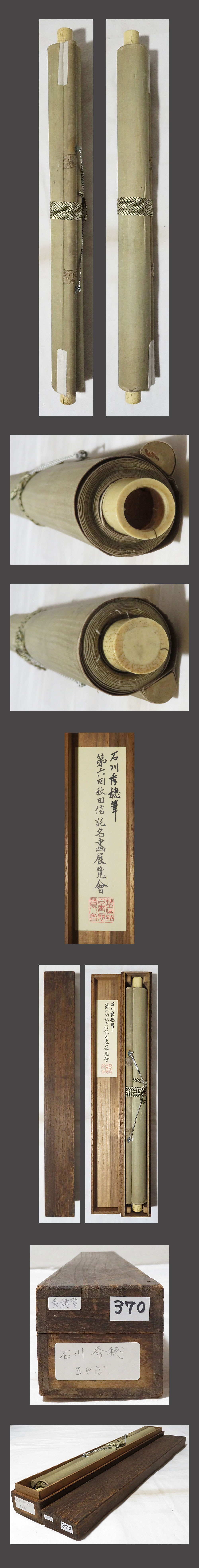 肉筆、真作保証。 作品に、時代感、多数のシミ、汚れ、折れ、巻きじわがあります。 表装に、時代感、多数のシミ、汚れ、折れ、巻きじわ、傷んでる箇所があります。 表装上部に、経年による傷んでる箇所があります。 表装裏側に、経年によるシミ、汚れ、スレ、補修箇所があります。 箱は合わせ箱です。軸先にヒビがあり、右側軸の軸蓋はありません。 石川秀穂 略歴:(明治27年10月5日~昭和31年)日本画。大館市弁天町生まれ。 富次郎の長男で本名新明。父富次郎は、狩野派の石川漁舟(初め北雲) の号で知られた。富次郎は秋田市の小室怡々(いい)斎の門人というから、 寺崎広業と同門ということになる。父を画家に持った秀穂は、 十七歳で角館町出身の西宮礼和(当時東京)に就いて四条派を学び、 のち歴史画の高橋広湖に入門している。広湖は尾竹竹坡とともに、 巽画会の重鎮として知られ、土崎の荒井広成の師でもあった。 広湖の次に花鳥山水の池上秀畝の伝神画塾にはいって学ぶ。 下記の真作保証について・注意事項をよくご覧の上、 お気に召された方に、お譲り致しますので、ご入札を宜しくお願い致します。 |
