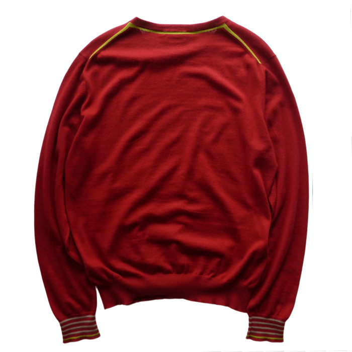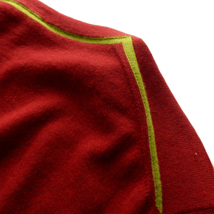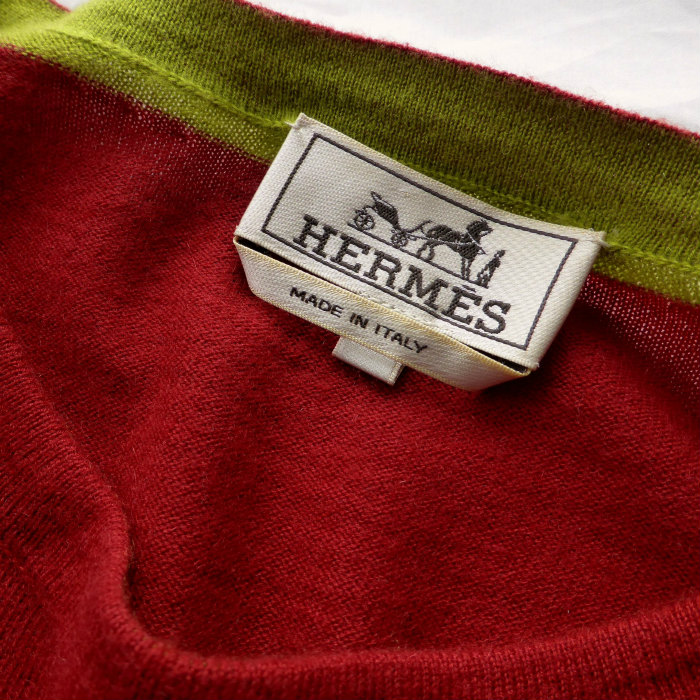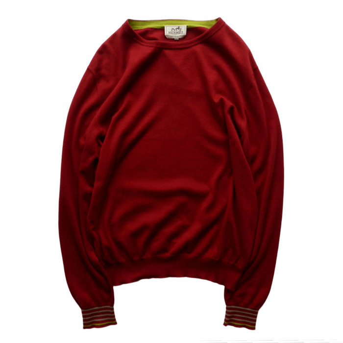 | エルメスのクルーネックニット。 カシミア×コットンのやわらかく、滑らかな肌触りと映えるレッドカラー。 ビビットなレッドにリブのボーダーやショルダーラインのグリーンカラーの斬新な配色が目を惹きます。 程よいデザイン性が素材の良さを引き立てる、エルメスらしい上品な仕上がりです。 一枚でもインナー使いでも重宝し、様々なスタイルで活躍する一着です。 |