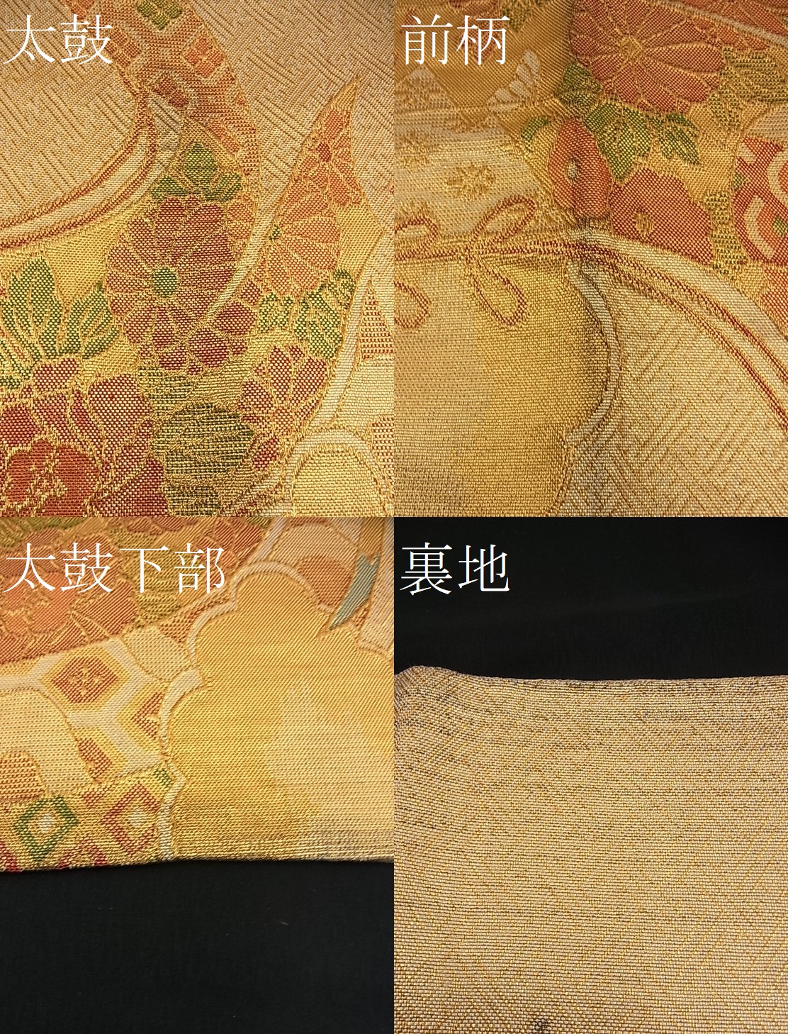 | 【正絹・芯なし】 状態は接写画像のように 太鼓・前柄・太鼓下部・裏地に薄い汚れ、裏地にスレがございますが その他特に目立ったシミ汚れなどもなく大変良い状態です。 大変上質な逸品になります。 お安く出品致しますので、是非この機会にいかがでしょうか?